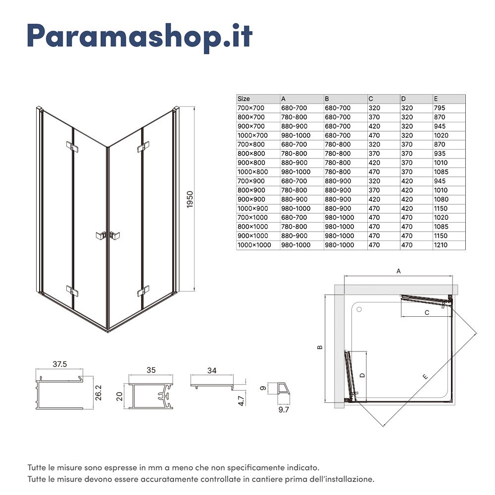 Box doccia angolare 70x70cm doppia anta a libro profili cromati e vetro da 8mm trasparente h195 | Fiji
