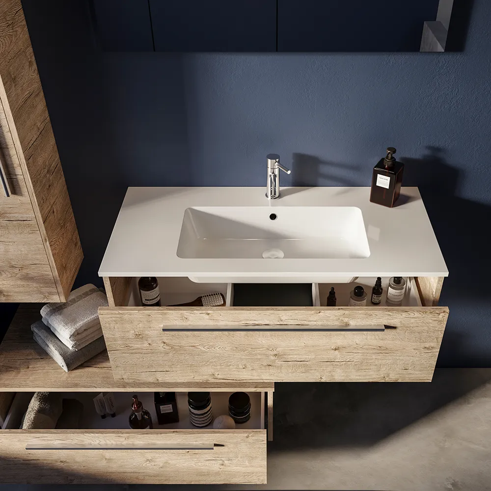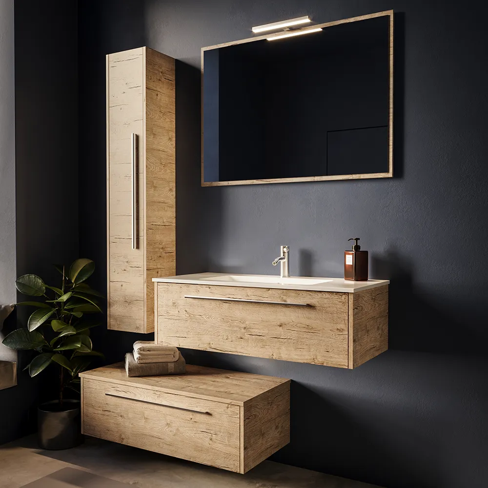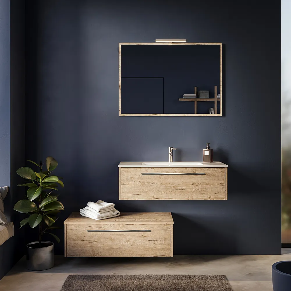 Mobile bagno sospeso modulare 100cm due cassetti rovere naturale con lavabo e specchio | Aoki