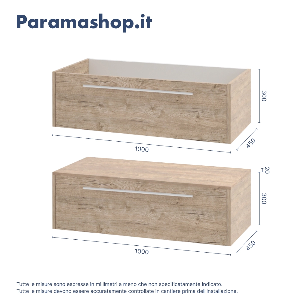 Il mobile è dotato di due ampi cassetti con chiusura soft-close, ideali per riporre asciugamani, prodotti per la cura del corpo, cosmetici e altri articoli da bagno. I cassetti sono progettati per essere posizionati a seconda dei tuoi gusti e delle esigenze di spazio.