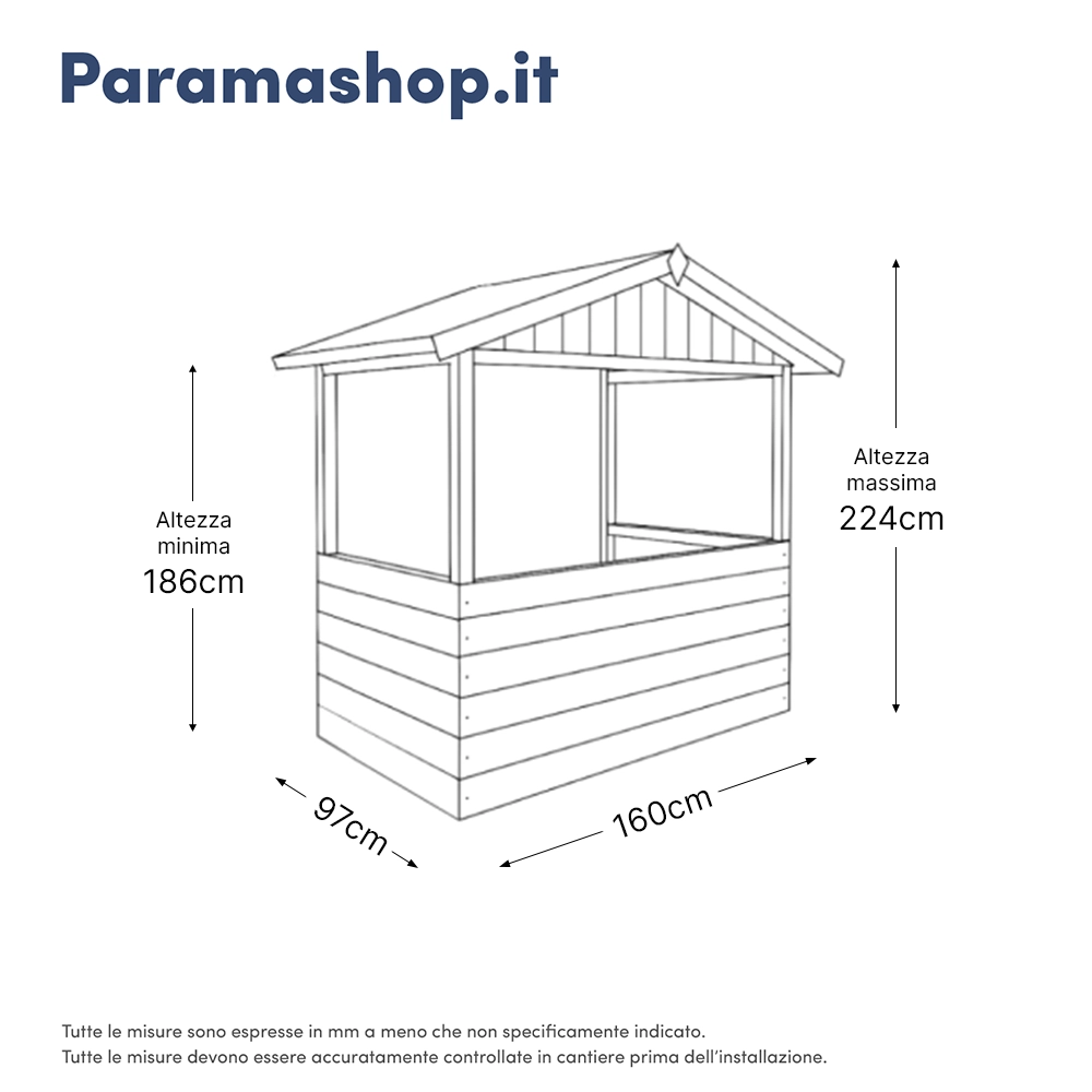 La bancarella misura 182 cm di larghezza e 137 cm di profondità. La base utile è di 160 x 97 cm, con un’altezza massima di 224 cm. Non è previsto un piano d’appoggio, ma la struttura può essere utilizzata come base per una postazione espositiva.