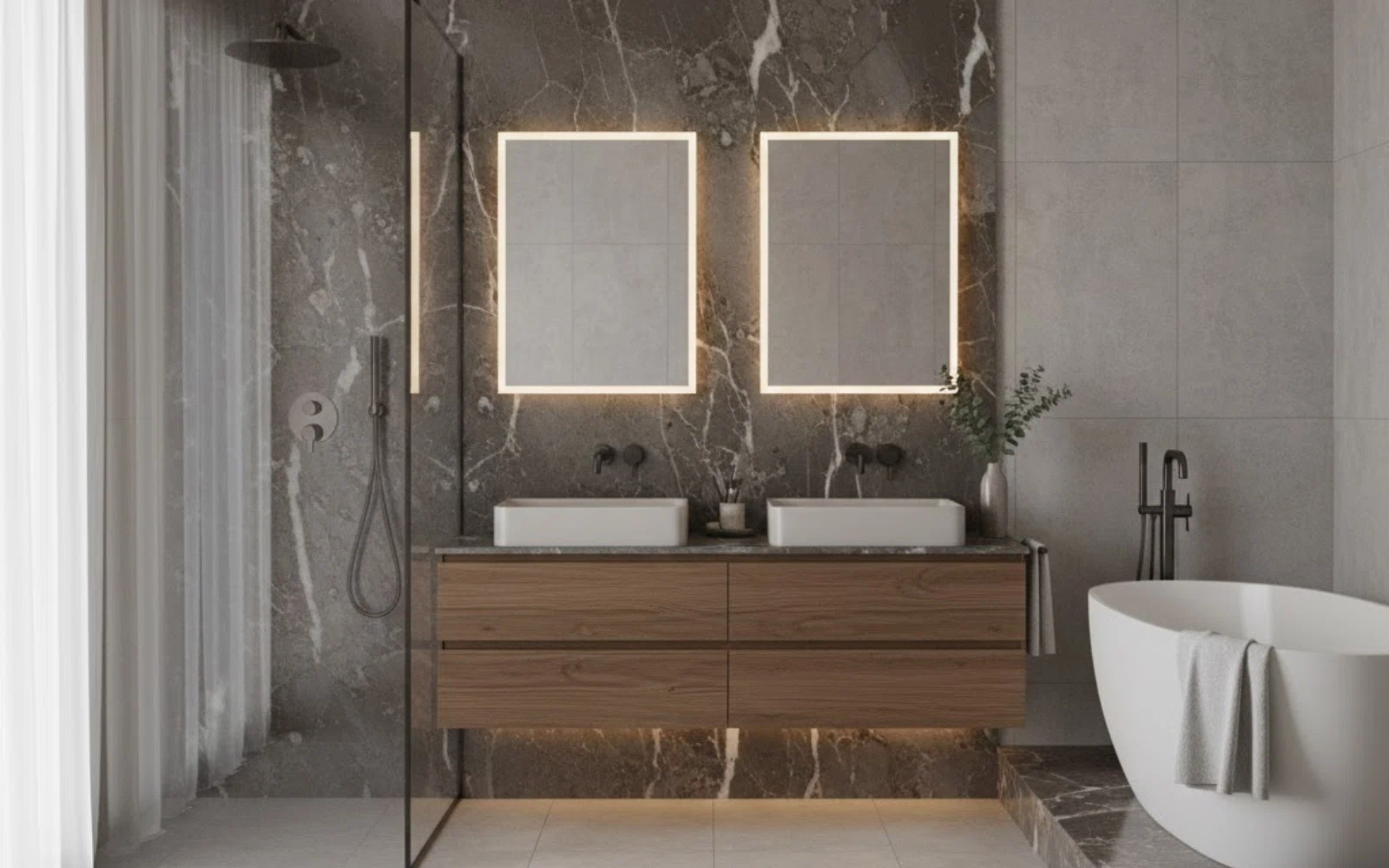 Mobile sospeso in noce con venatura continua, top in gres Calacatta sottile, rubinetteria ottone spazzolato rétro, specchio ovale con LED perimetrale dimmer. Parete walk-in in lastre venate (tono caldo), profilo doccia ottone. Pittura pareti greige opaco.