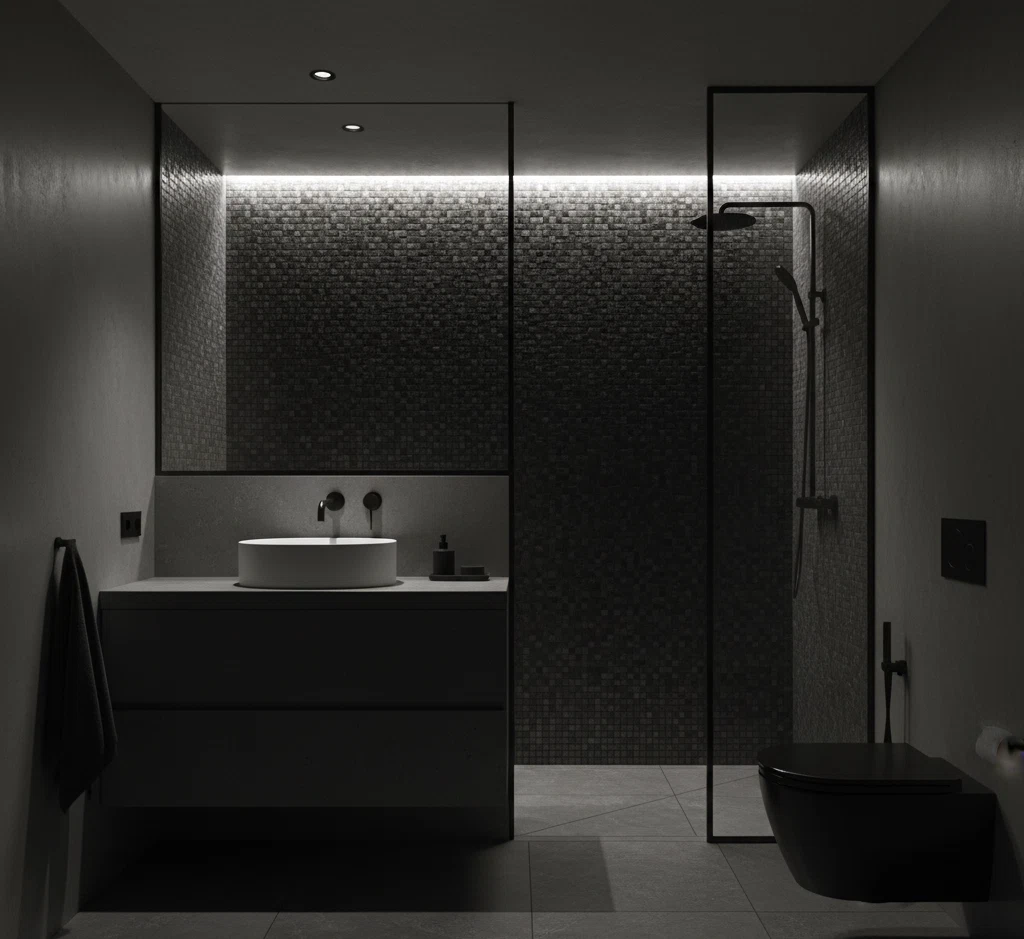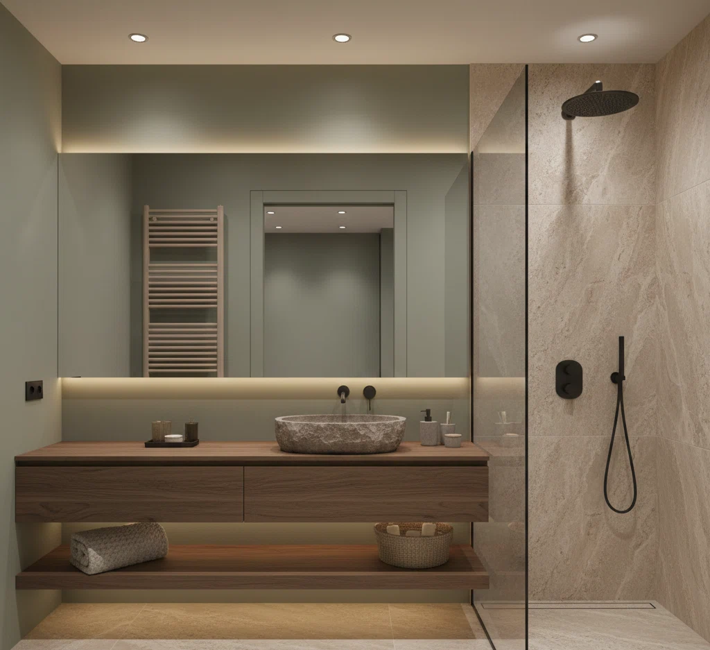 Tieni la luce calda 2700–3000 K con dimmer. Aggiungi luce verticale ai lati dello specchio (niente abbaglio), strip LED radenti per valorizzare texture e un punto d’accento in doccia (nicchia retroilluminata).