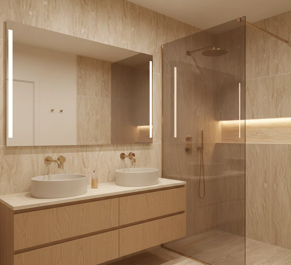 Gres travertino a vena aperta su pareti principali, mobile rovere chiaro, vetro fumé per il walk-in con profili champagne. Rubinetti color champagne o oro chiaro, luce 3000 K dimmer. Pittura avorio opaco.