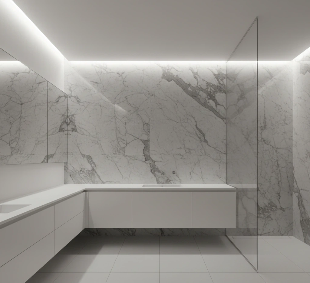 Volumi candidi ultra-matte, lavabo integrato nel top, ante senza maniglia. Walk-in “scomparsa” con vetro senza profili, parete iconica in lastre maxi (vena continua). Illuminazione invisibile: gole LED nel controsoffitto.