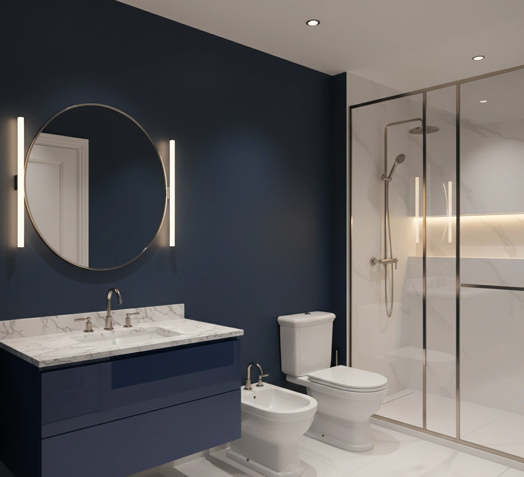 Pareti blu notte opaco (zona asciutta), sanitari bianchi, metallerie nichel. Mobile sospeso laccato blu con top marmo bianco. Walk-in con profili nichel e nicchia retroilluminata. Specchio tondo con LED verticale ai lati.