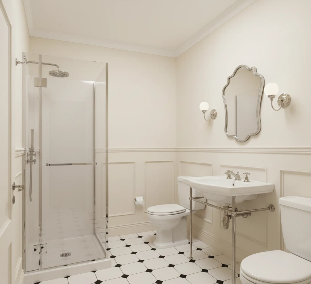 Sanitari rétro (linee morbide), miscelatori a croce in nichel lucido, boiserie bassa verniciata crema + pittura traspirante seta matte. Walk-in con cornice sottile cromata, pavimento a scacchi bianco/nero in gres. Specchio con cornice sagomata e applique in vetro opalino.
