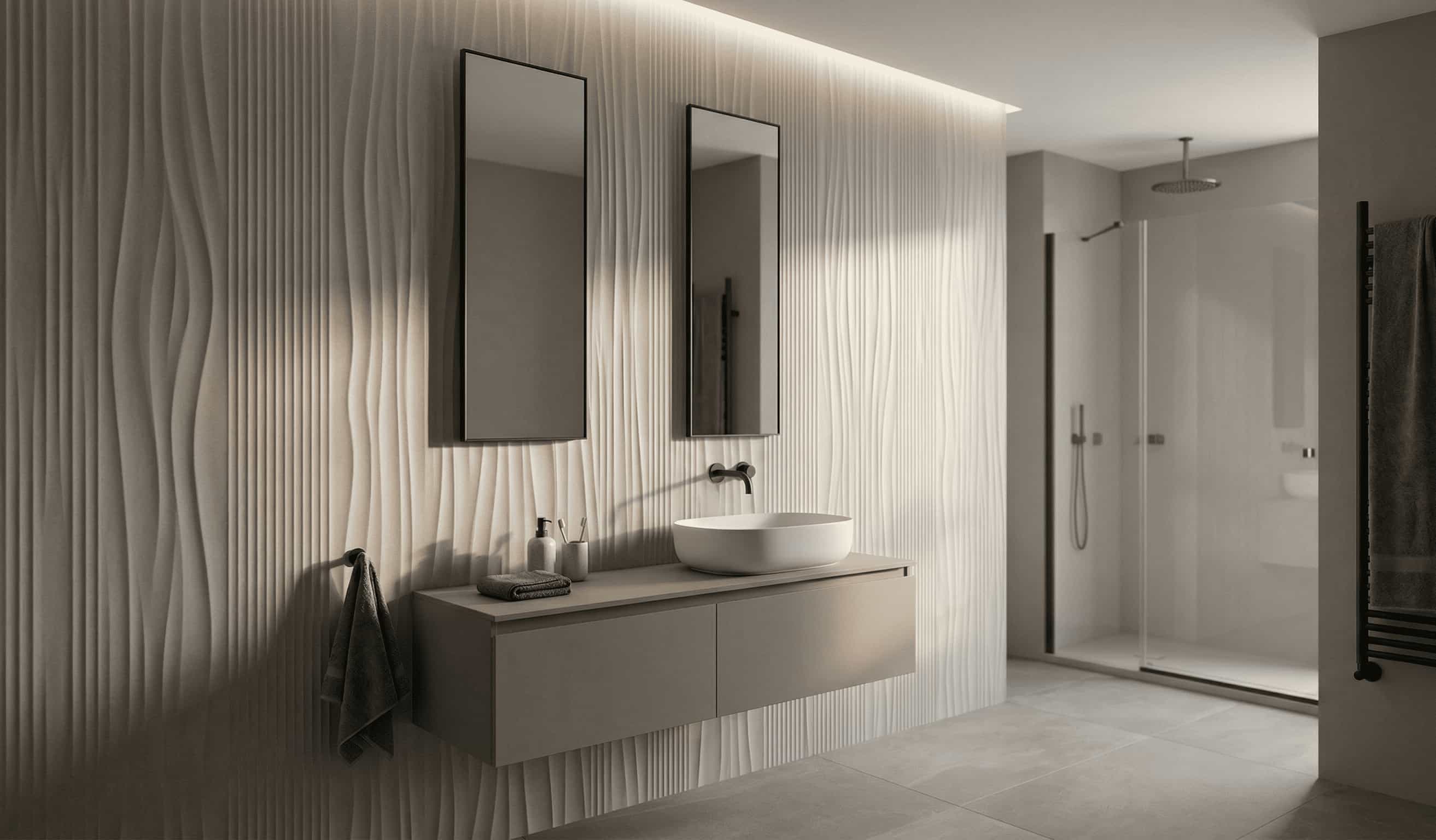 Carta vinilica materica 3D tono su tono (onde/righe leggere) su una parete; specchi verticali ai lati del lavabo, luce radente che crea ombre delicate. Minimal couture, super contemporaneo.