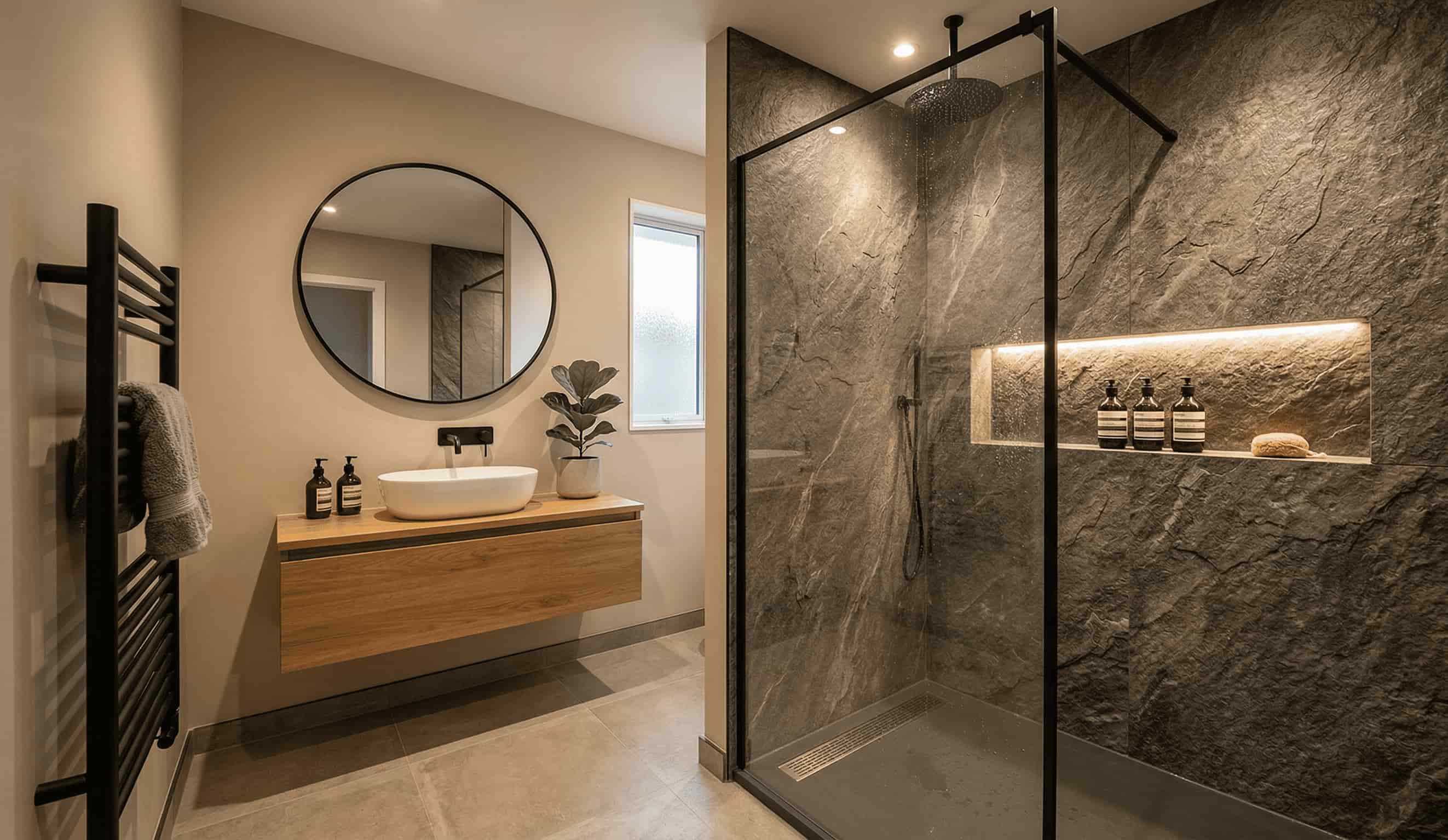 Interno del box rivestito con fibra di vetro texture pietra, finita con resina protettiva; resto del bagno in tinta neutra. Nicchia doccia integrata e luce a 3000 K. Massima durabilità in zona bagnata.
