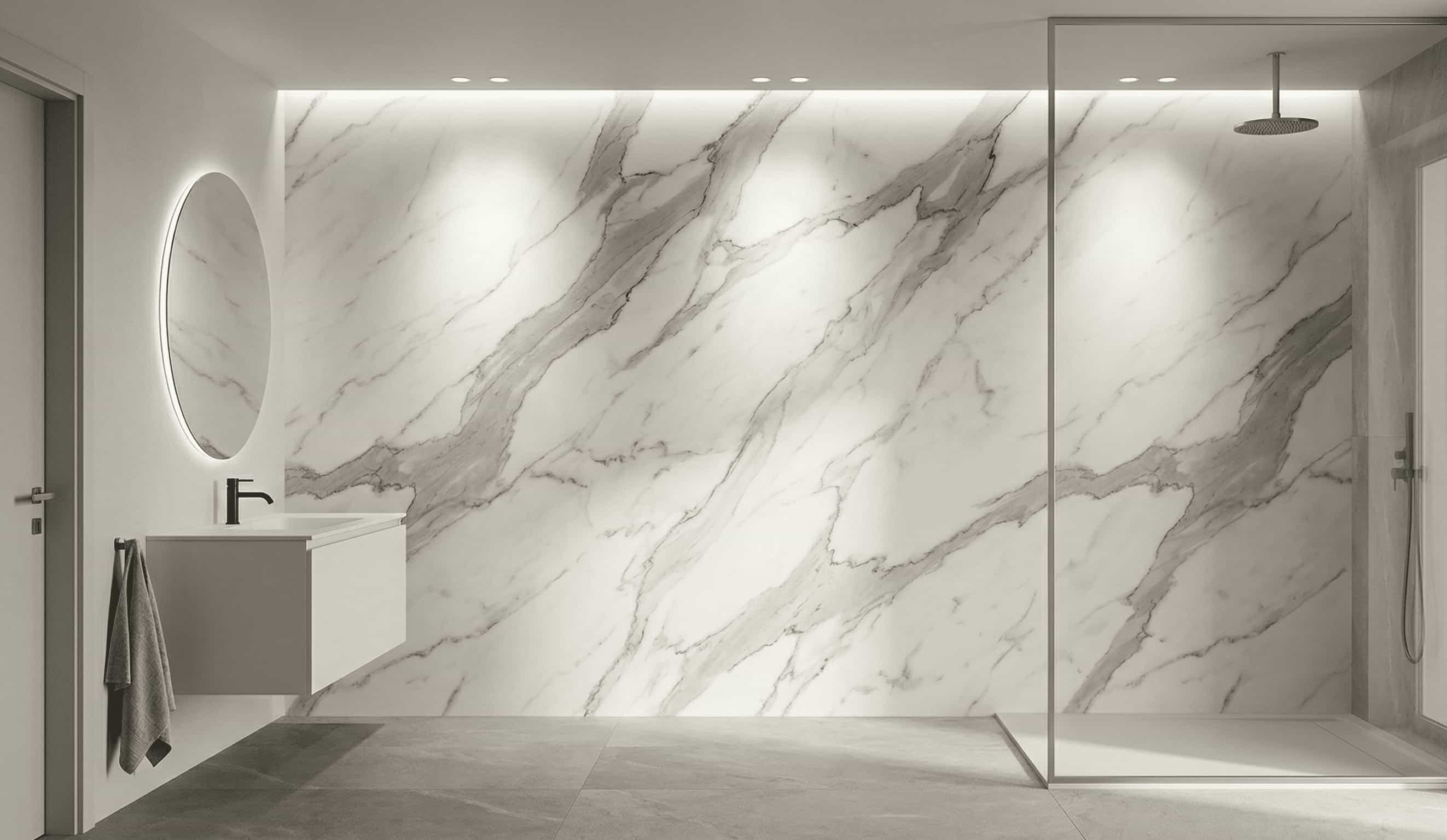 Carta vinilica effetto marmo a vena continua sulla parete di fronte all’ingresso; walk-in con vetro extra-chiaro e profili sottili, mobile bianco matte. Illuminazione radente dal soffitto per amplificare le vene.