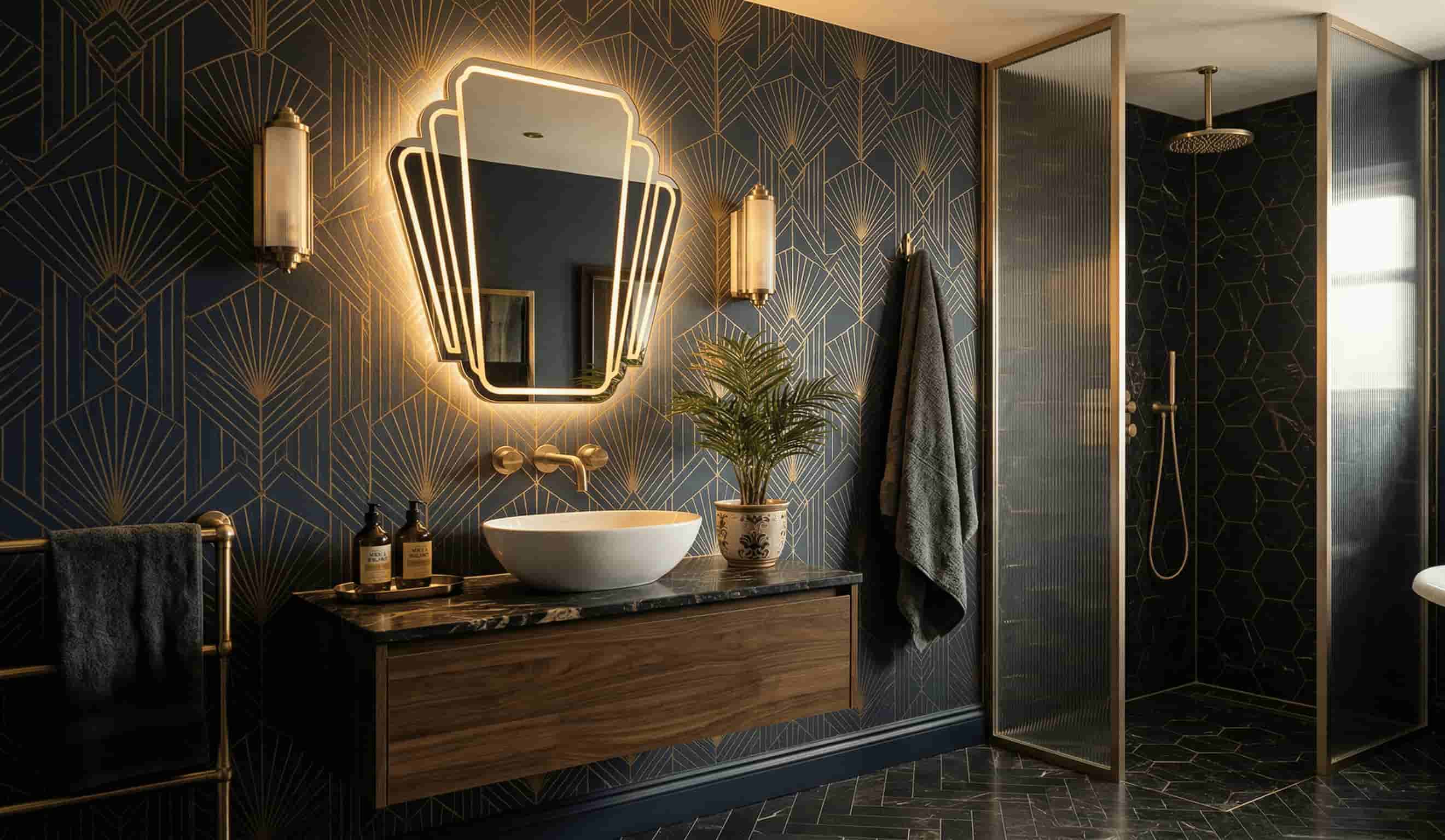 Pattern geometrico art déco (oro su fondo opaco) in vinilico; rubinetteria ottone spazzolato, specchio sagomato con LED perimetrale. Box doccia con profili champagne. Mood: rétro-chic caldo.