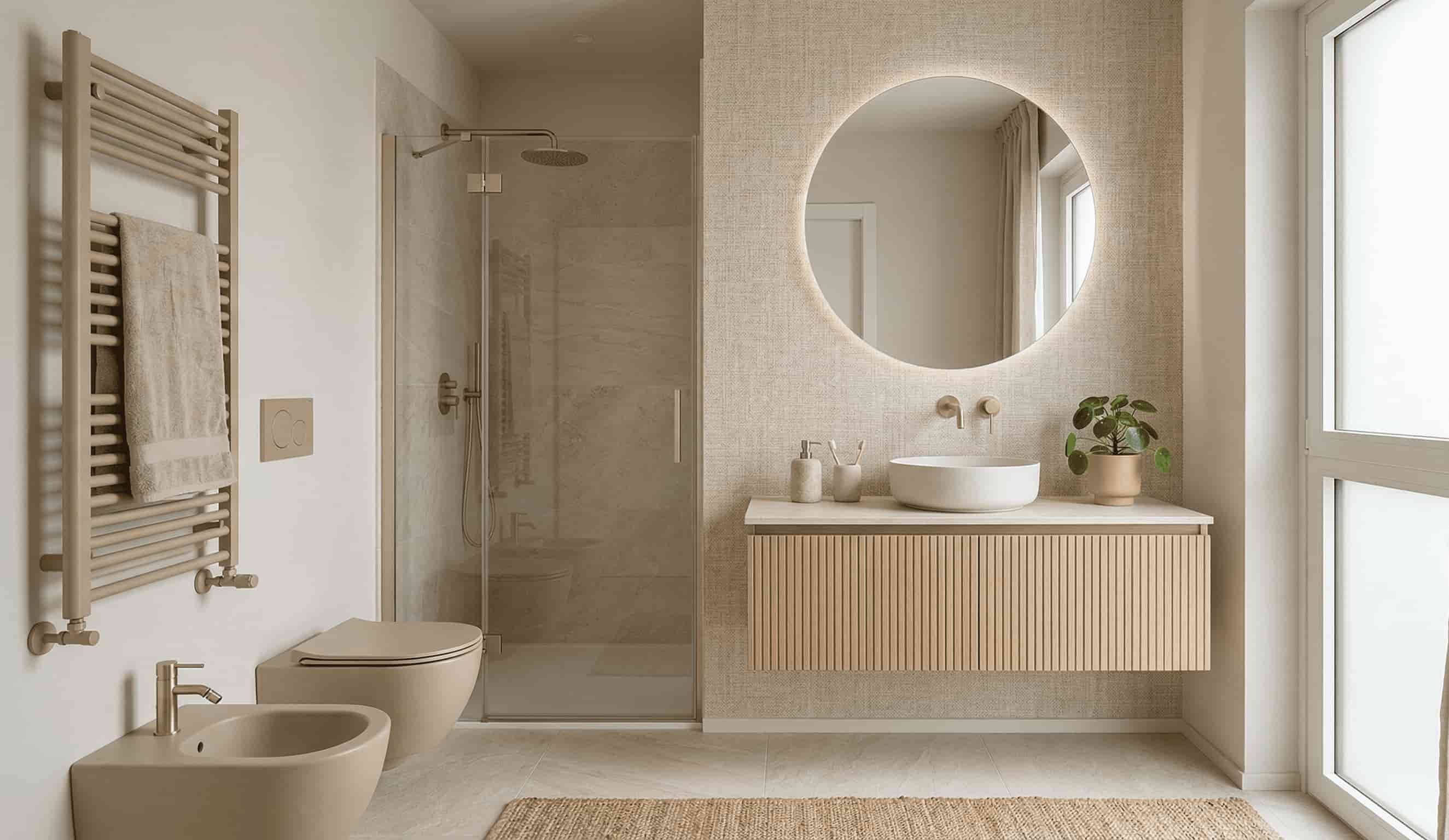 Carta TNT effetto lino (tatto tessile) su parete del lavabo; mobile cannettato sabbia, sanitari sospesi e termoarredo color sabbia. Atmosfera morbida, elegante e luminosa.