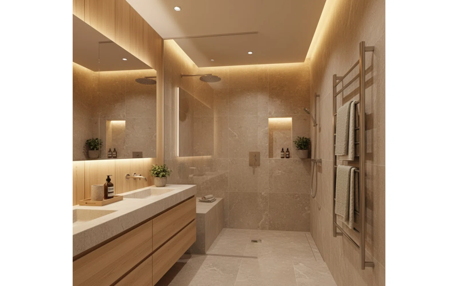 Trasforma il tuo bagno in una vera micro spa domestica con materiali caldi e naturali. Scegli superfici materiche come legno effetto e pietra chiara, ideali per creare un’atmosfera rilassante. Integra una seduta nella doccia per i momenti di relax e un termoarredo verticale per tenere gli asciugamani sempre caldi e a portata di mano.