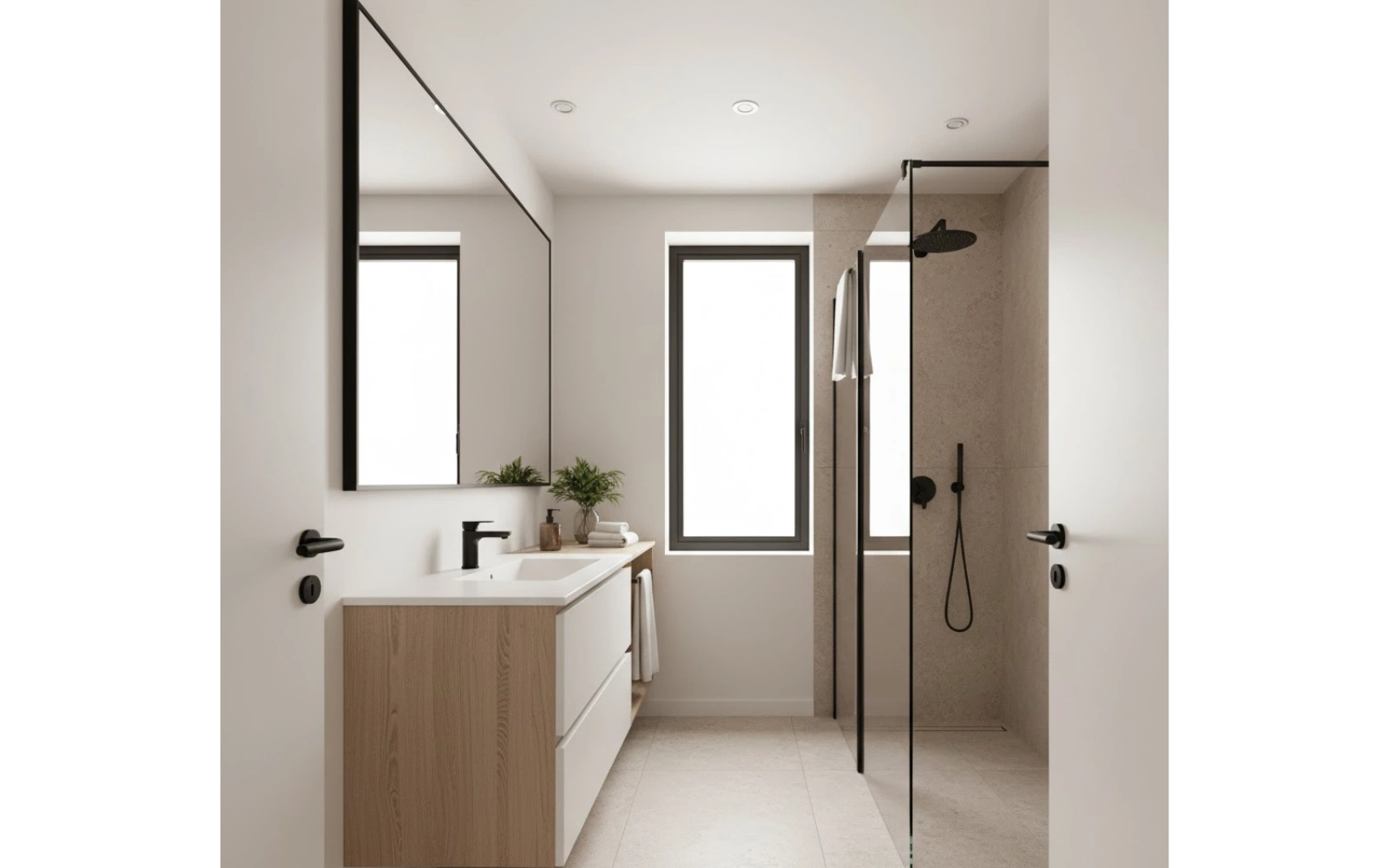 Prediligi soglie a raso e materiali uniformi per un pavimento continuo che unisce eleganza e praticità. Per la privacy, scegli vetro satinato o fumé e completa con una palette chiara valorizzata da dettagli in metallo spazzolato: equilibrio perfetto tra luminosità e stile contemporaneo.