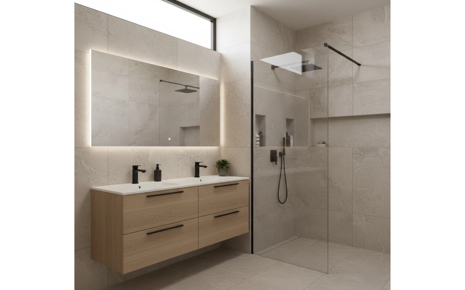 Scegli una palette sabbia o greige con tocchi di nero opaco come accento per definire i dettagli. Il piatto doccia filo pavimento e le nicchie porta-prodotti assicurano continuità visiva e una manutenzione semplice, rendendo il bagno pratico e raffinato allo stesso tempo.