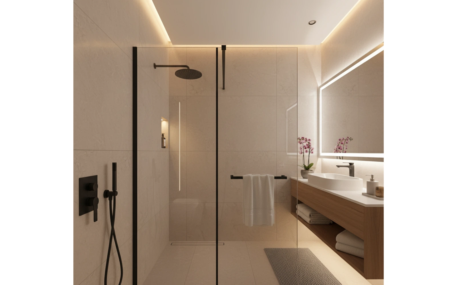 Un bagno in stile hotel vibe trasforma la quotidianità in un’esperienza di relax. Punta su una parete walk-in trasparente in vetro da 6–8 mm con trattamento anticalcare, abbinata a un piatto doccia a filo pavimento per un effetto elegante e continuo.