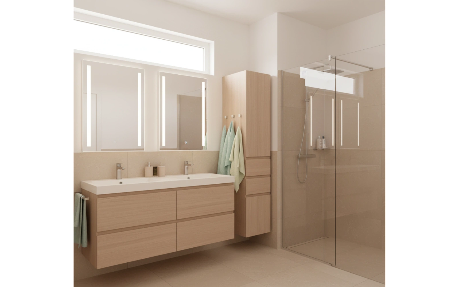 Il bagno open & bright punta tutto sulla luce e sulla continuità visiva. Le pareti in vetro a tutta altezza e la doccia walk-in lineare ampliano lo spazio e lasciano filtrare la luminosità naturale, rendendo l’ambiente arioso e moderno.