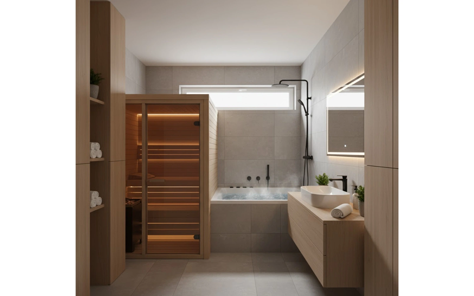 Se si dispone di una stanza separata, le possibilità si ampliano. Qui è possibile combinare sauna e bagno turco, dedicando almeno 10 m² all’area benessere. L’accesso dovrebbe essere riservato, preferibilmente vicino alla zona notte, con un sistema di ricambio d’aria e scaldasalviette elettrico per mantenere il comfort termico costante.