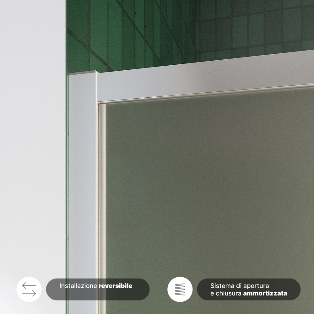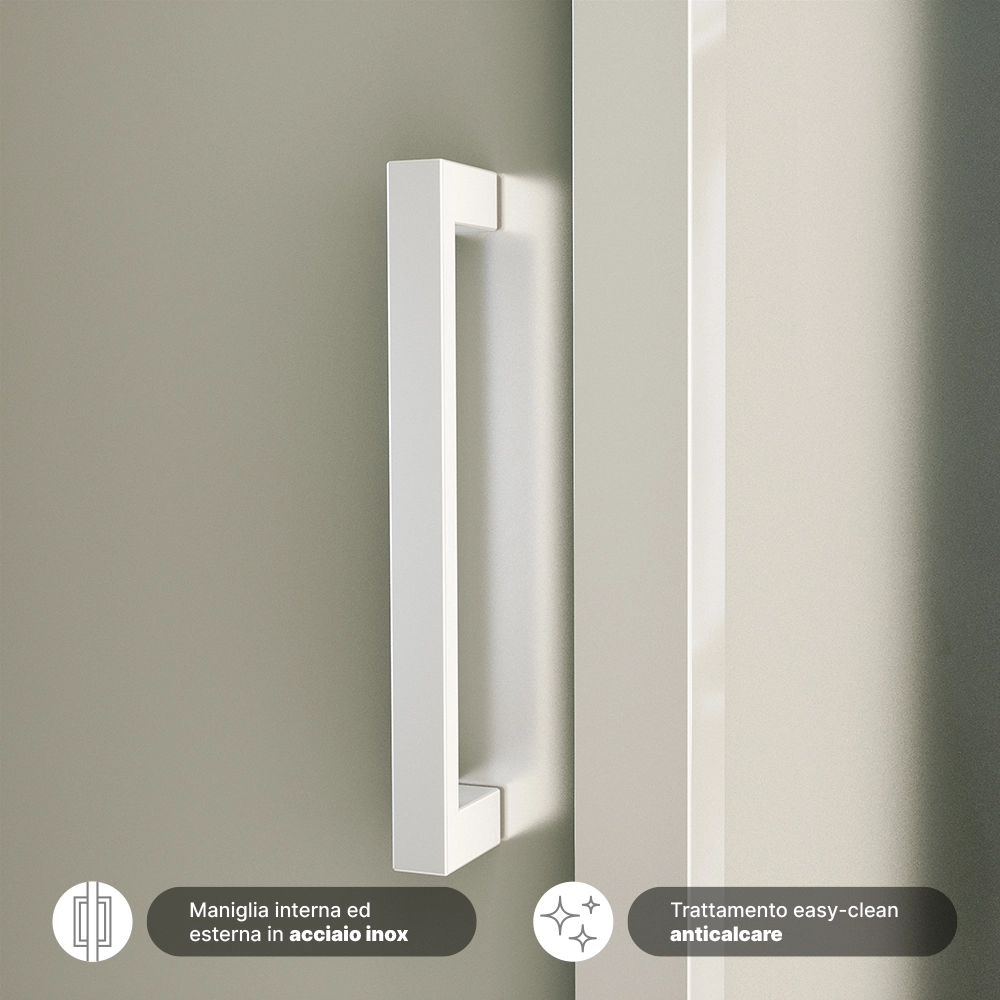 Il vetro temperato da 6mm, certificato secondo gli standard EN12150-1, è un elemento chiave che garantisce sicurezza e resistenza. La disponibilità della versione trasparente o opaca offre una personalizzazione ulteriore, mentre il trattamento easy-clean anticalcare rende la manutenzione del vetro un'operazione rapida e senza sforzi.