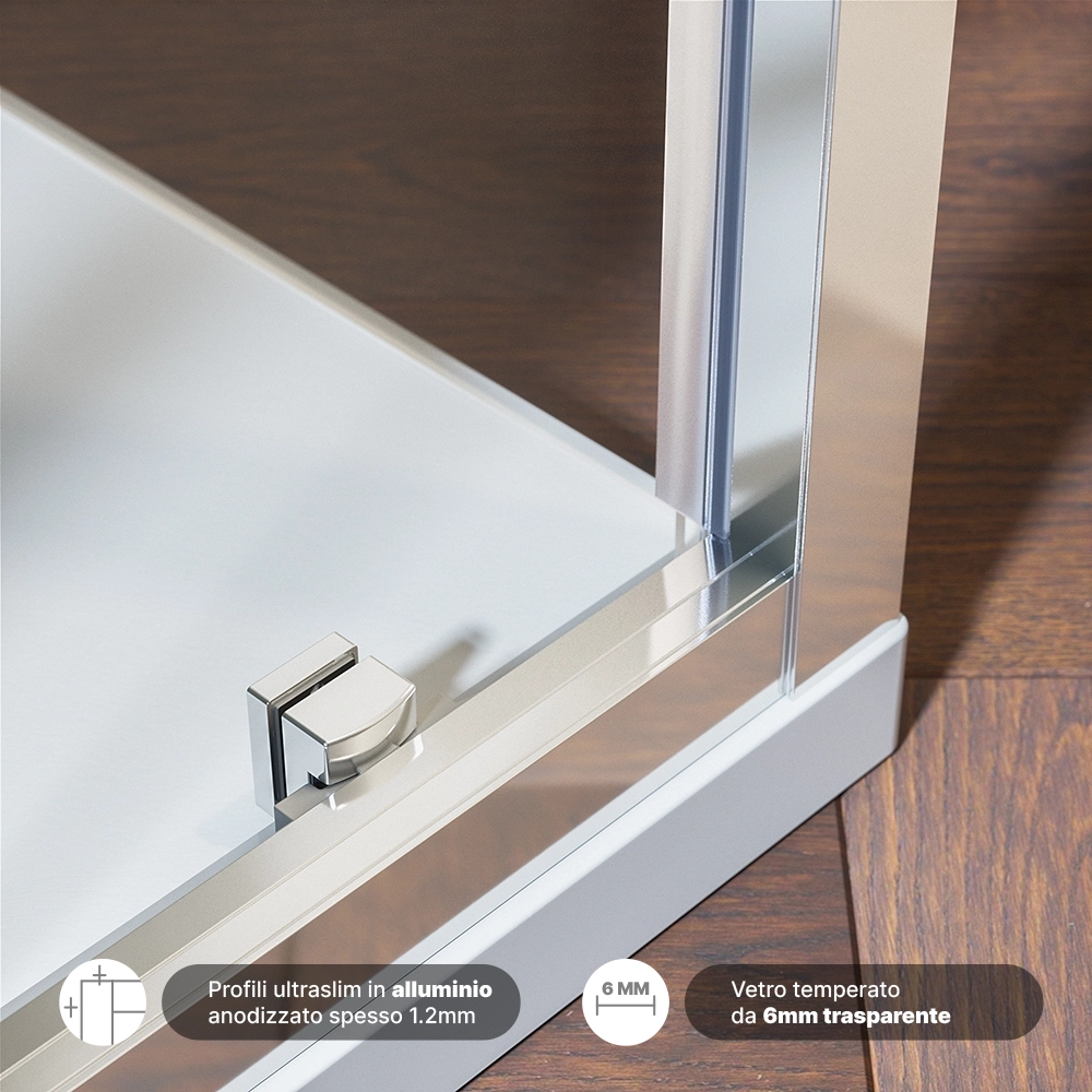 Il vetro temperato da 6mm, certificato secondo gli standard EN12150-1, è un elemento chiave che garantisce sicurezza e resistenza. La disponibilità della versione trasparente o opaca offre una personalizzazione ulteriore, mentre il trattamento easy-clean anticalcare rende la manutenzione del vetro un'operazione rapida e senza sforzi.