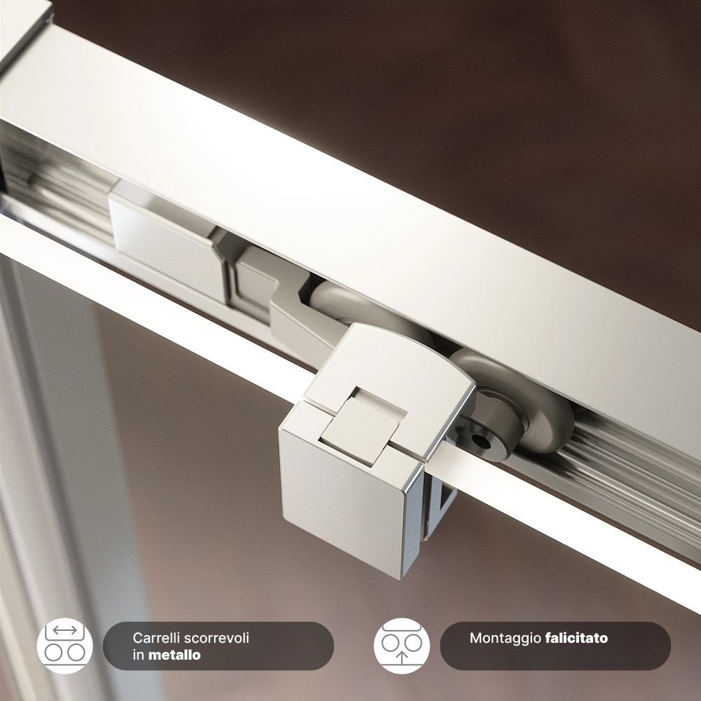 I carrelli scorrevoli in metallo, con cover cromata e testati per oltre 100.000 utilizzi, garantiscono una funzionalità impeccabile. Questa dimensione combinata con l'apertura scorrevole rende il box doccia Aruba una scelta ideale per ottimizzare lo spazio in modo efficiente senza sacrificare la qualità.