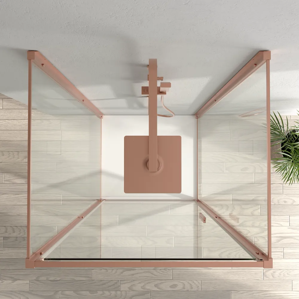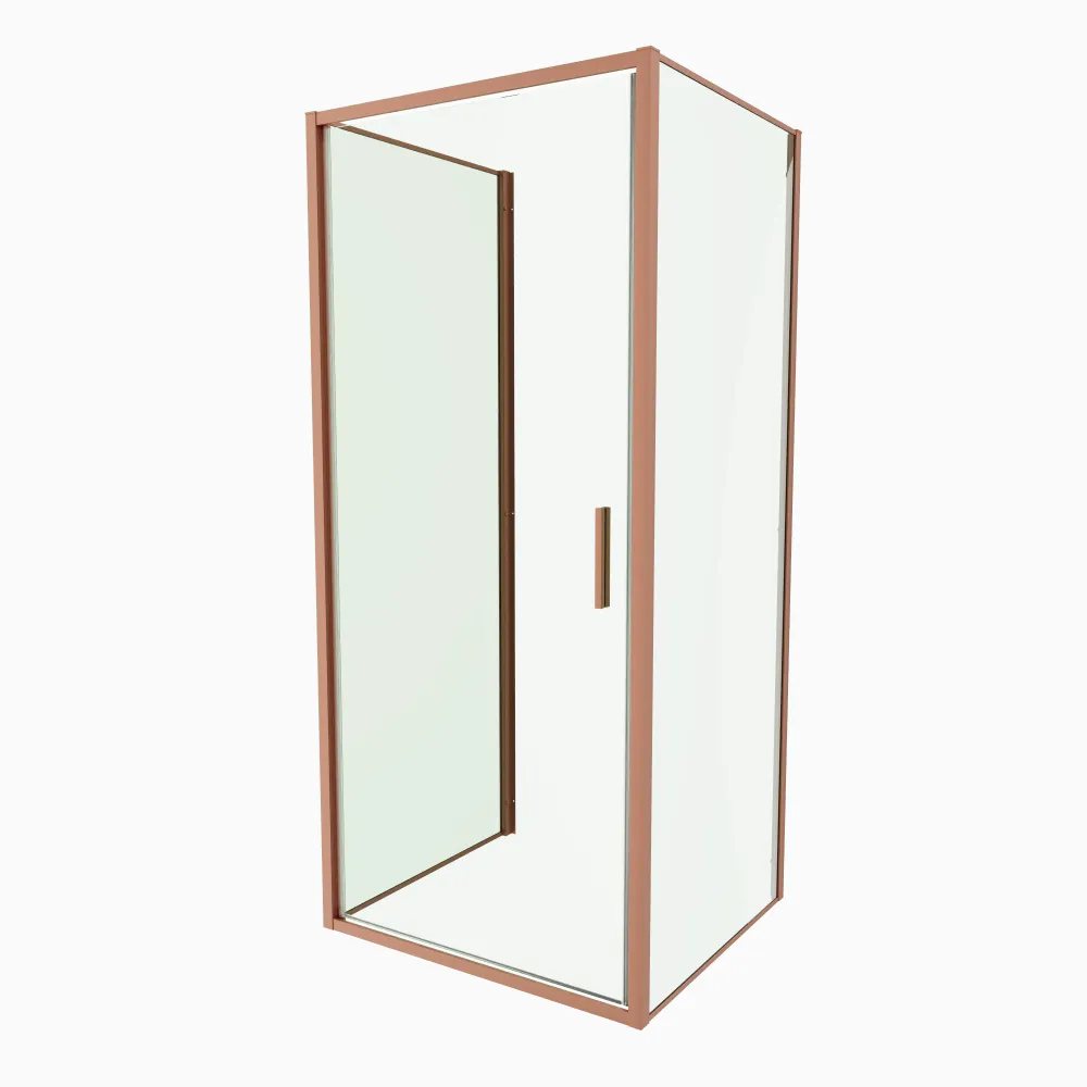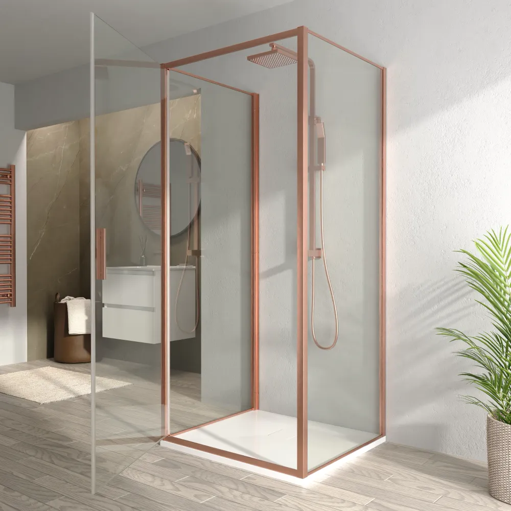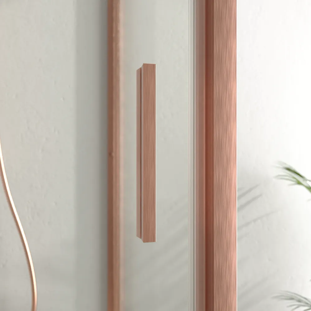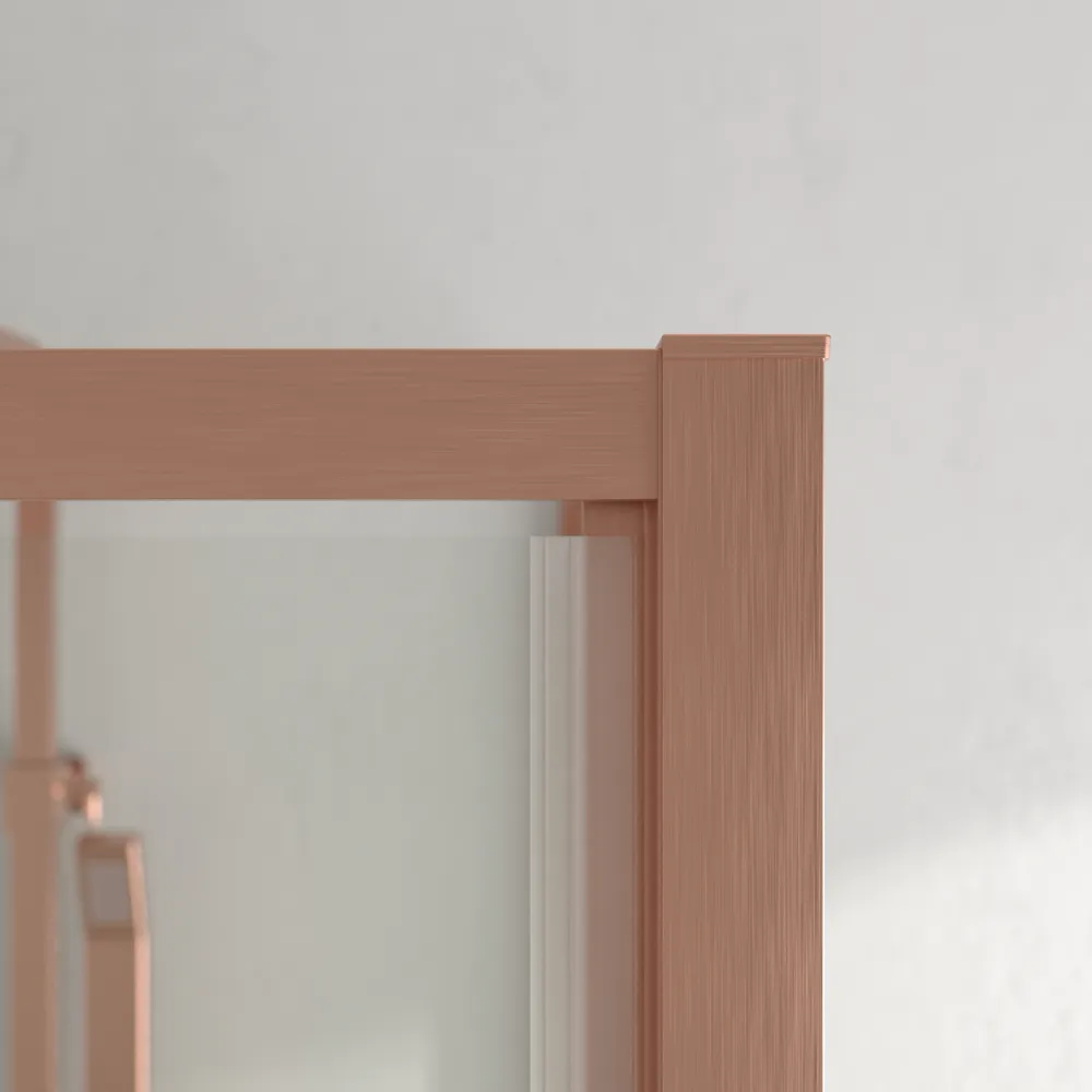 Il vetro temperato trasparente anticalcare da 6 mm garantisce resistenza e sicurezza, mentre i profili slim in alluminio rame spazzolato conferiscono un aspetto elegante e moderno. La maniglia coordinata in alluminio aggiunge un ulteriore tocco di raffinatezza.
