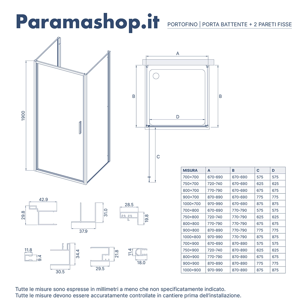 L’installazione è semplice e reversibile, permettendo di configurare il verso di apertura della porta in base alle necessità. Grazie a una tolleranza di 2 cm per lato, il box doccia si adatta facilmente a diverse misure, garantendo una perfetta compatibilità con lo spazio disponibile.