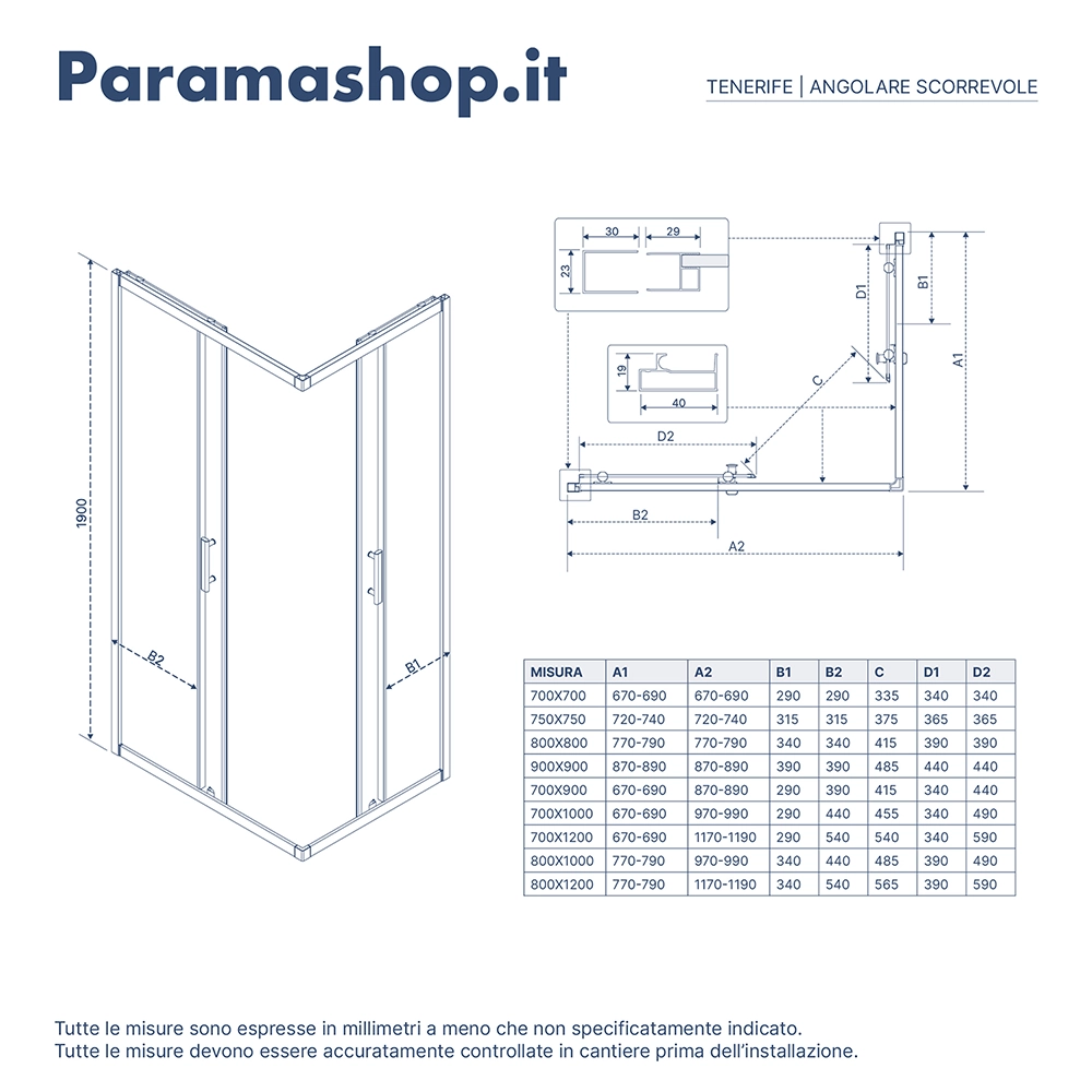 Box doccia 70x100 cm angolare scorrevole vetro 6mm trasparente h190 | Tenerife