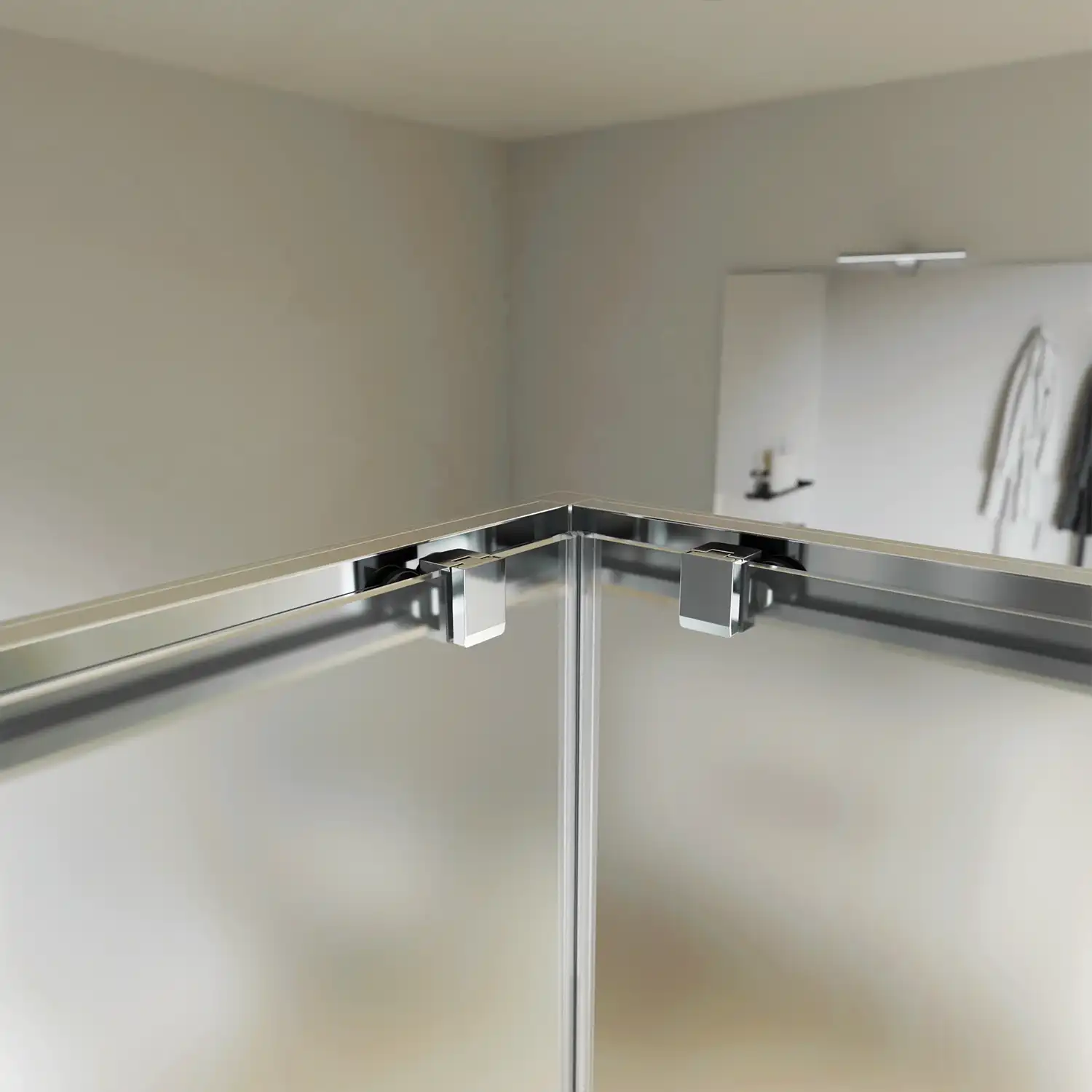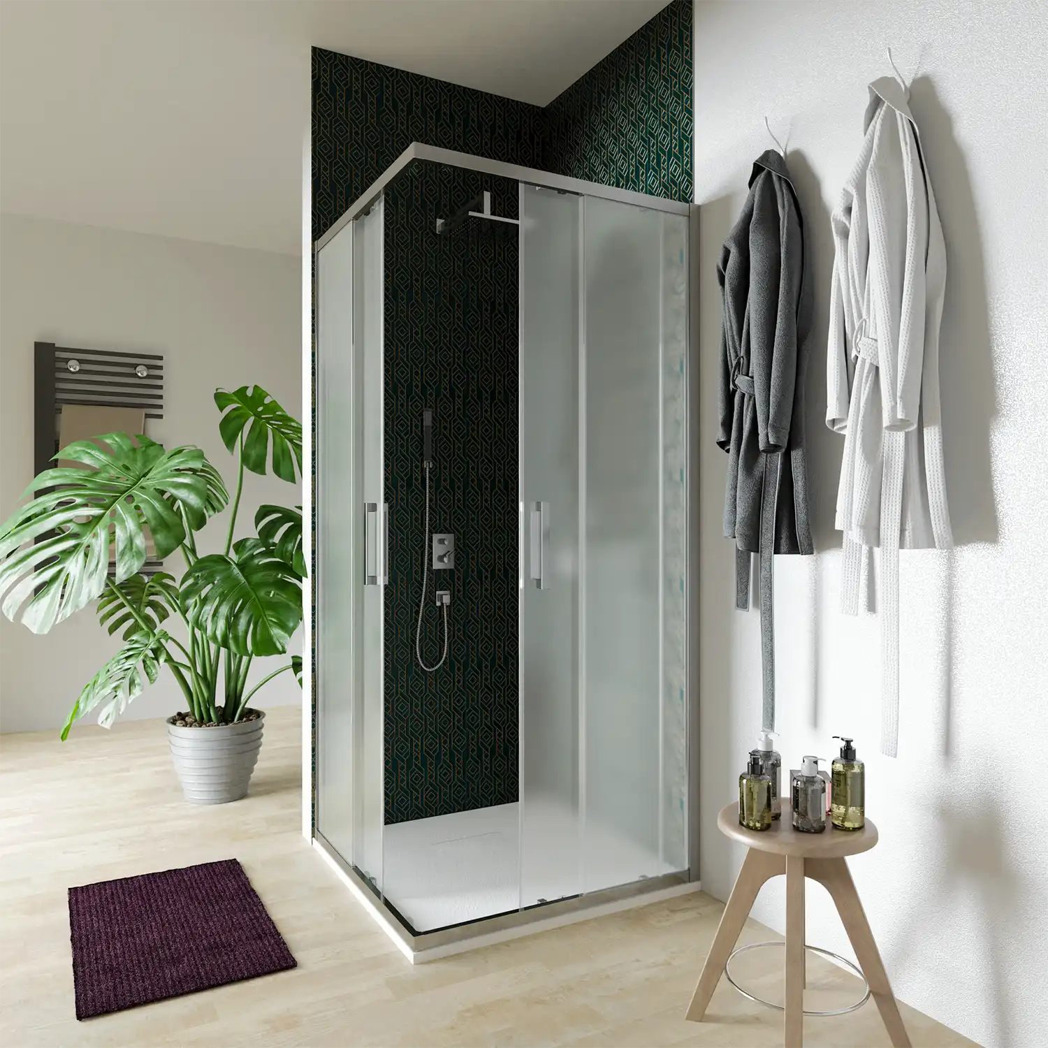 I profili flat in alluminio cromato dallo spessore di 1.2mm e il cristallo temperato da 6mm opaco (certificato EN12150-1) garantiscono robustezza e sicurezza nell'utilizzo del box doccia. Per evitare il deposito di calcare e per facilitare la pulizia è stato applicato ai vetri uno speciale trattamento anticalcare.