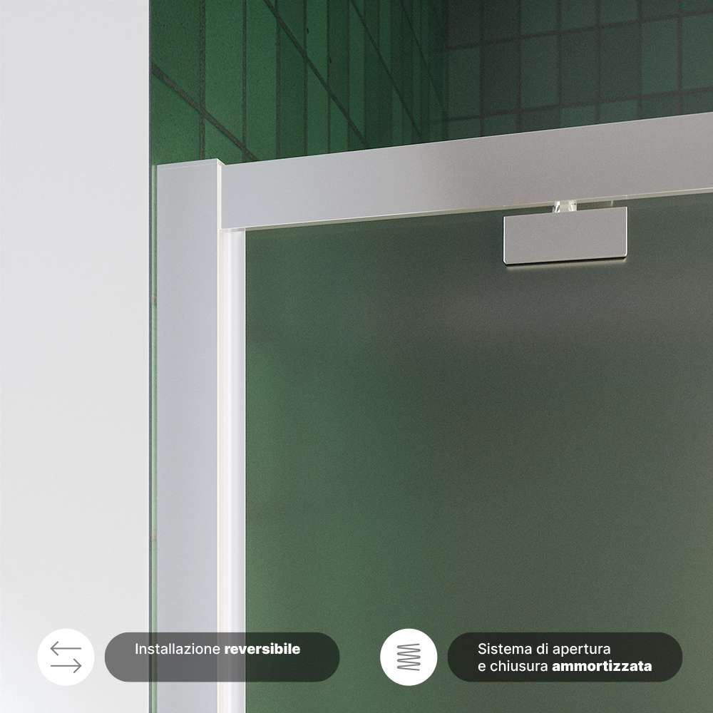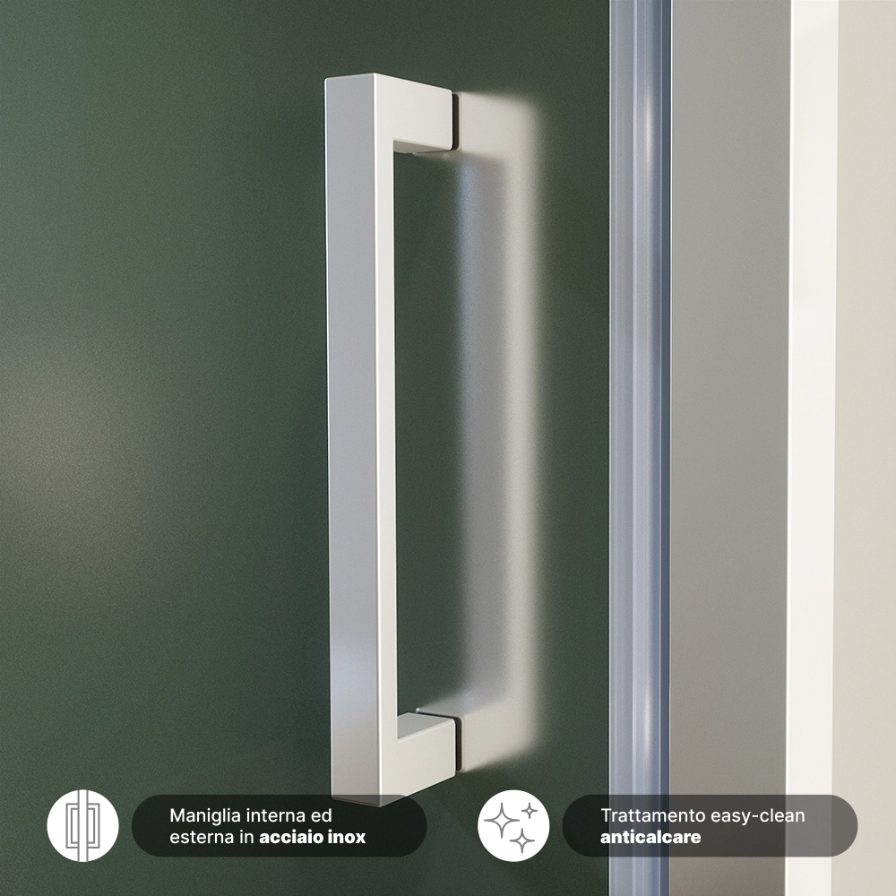 Il vetro temperato da 6mm, certificato EN12150-1, è disponibile in versione trasparente o opaca per soddisfare le tue preferenze estetiche. Inoltre, il trattamento easy-clean anticalcare facilita la manutenzione quotidiana, mantenendo il vetro sempre cristallino e privo di depositi calcarei.