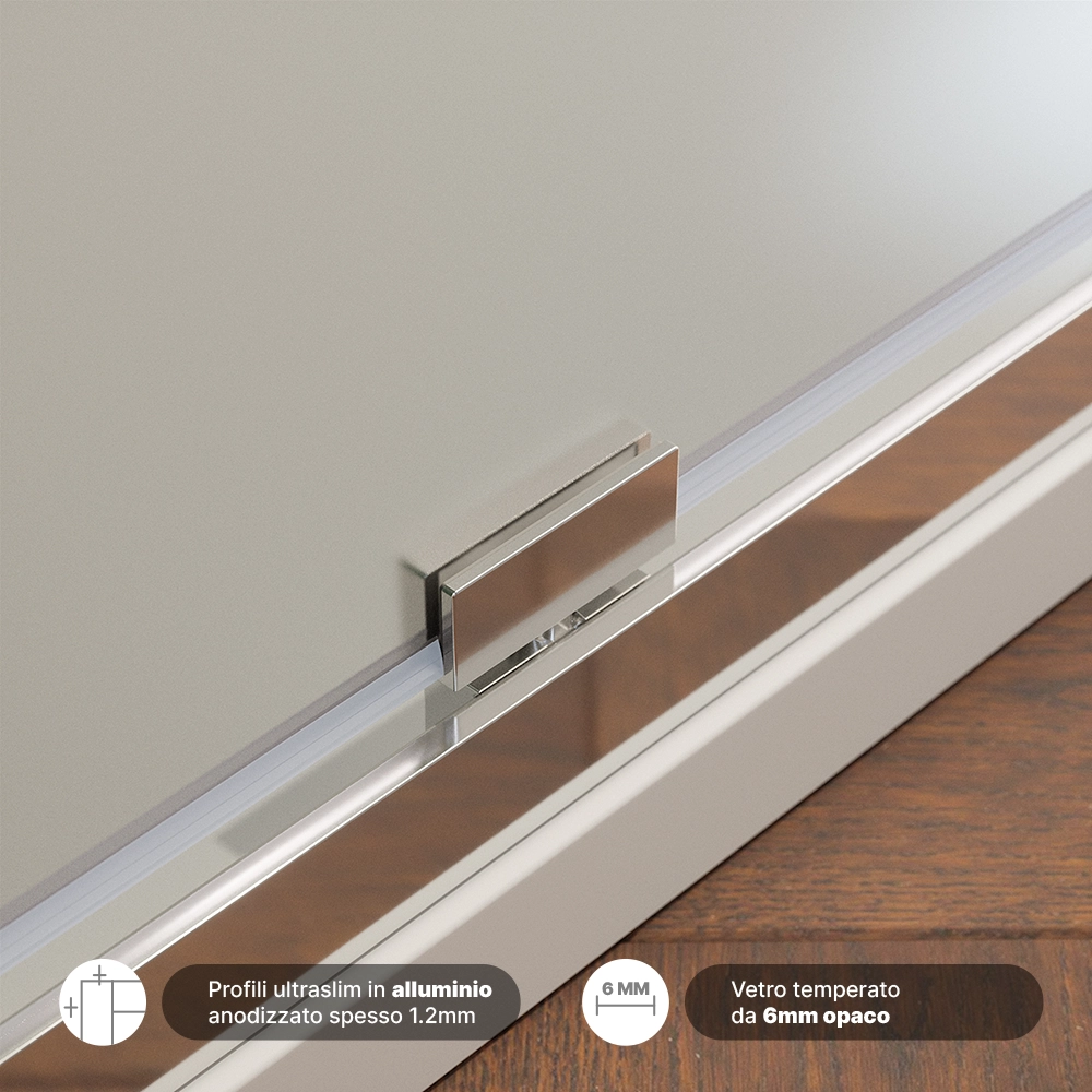 La sua altissima qualità è evidente nei dettagli dei profili ultraslim cromati in alluminio anodizzato, con uno spessore di soli 1.2mm. Questi profili non solo conferiscono un aspetto moderno ed elegante, ma garantiscono anche una robustezza che si traduce in durabilità nel tempo.