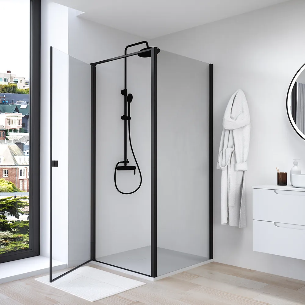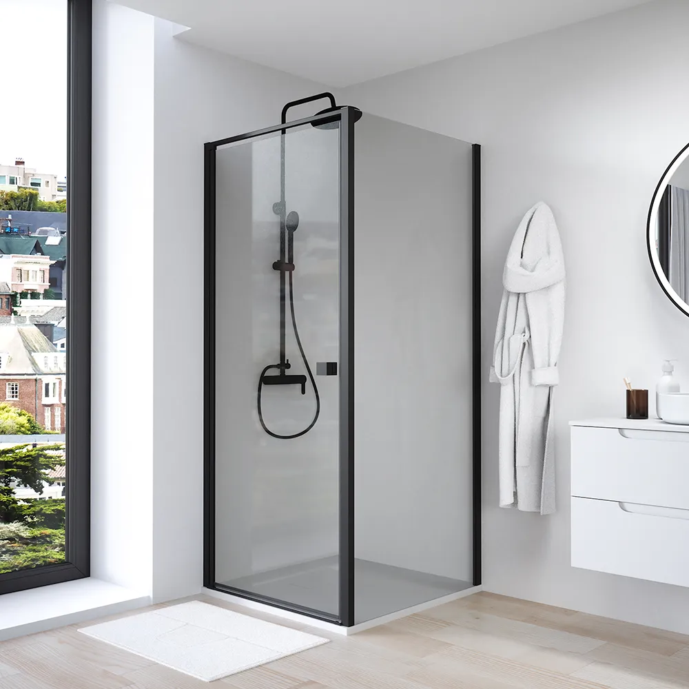 Box doccia 70x80 cm con apertura a battente e parete fissa, profili nero opaco e vetro da 8mm trasparente h195 | Bahamas