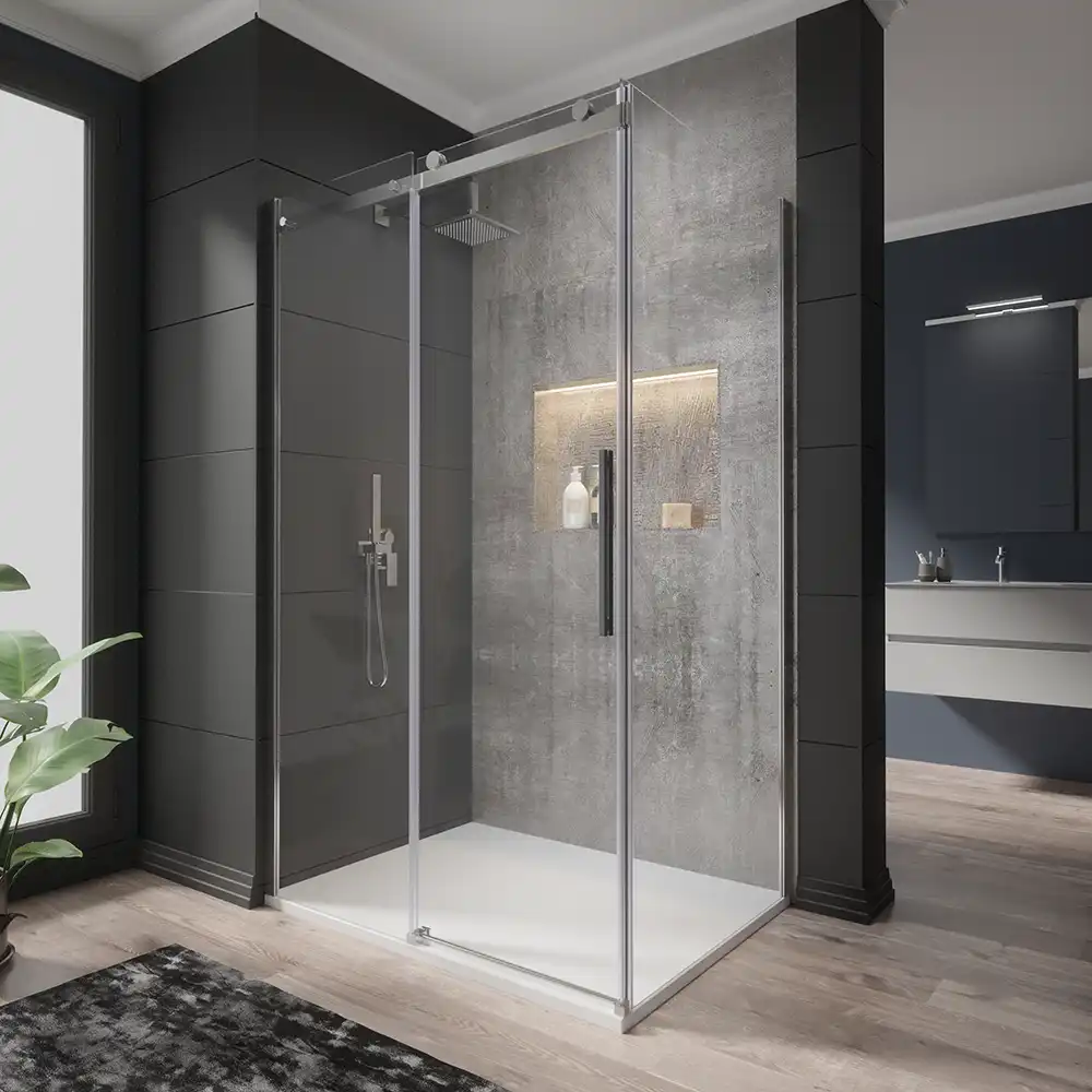 Il box doccia angolare Creta rappresenta l'apice dell'eleganza e della funzionalità nel mondo dei box doccia, grazie ai suoi peculiari profili cromati dalla forma squadrata e altamente contemporanea. Con le sue dimensioni di 80x130 cm, questo prodotto è l'ideale per offrire un'ampia area di doccia per un'esperienza confortevole. La sua struttura è realizzata con vetro temperato Trasparente di 8 mm di spessore, che garantisce una resistenza superiore e una maggiore sicurezza durante l'uso. La sua altezza di 195 cm crea un'atmosfera spaziosa, consentendo di godere dello spazio doccia in pieno relax.