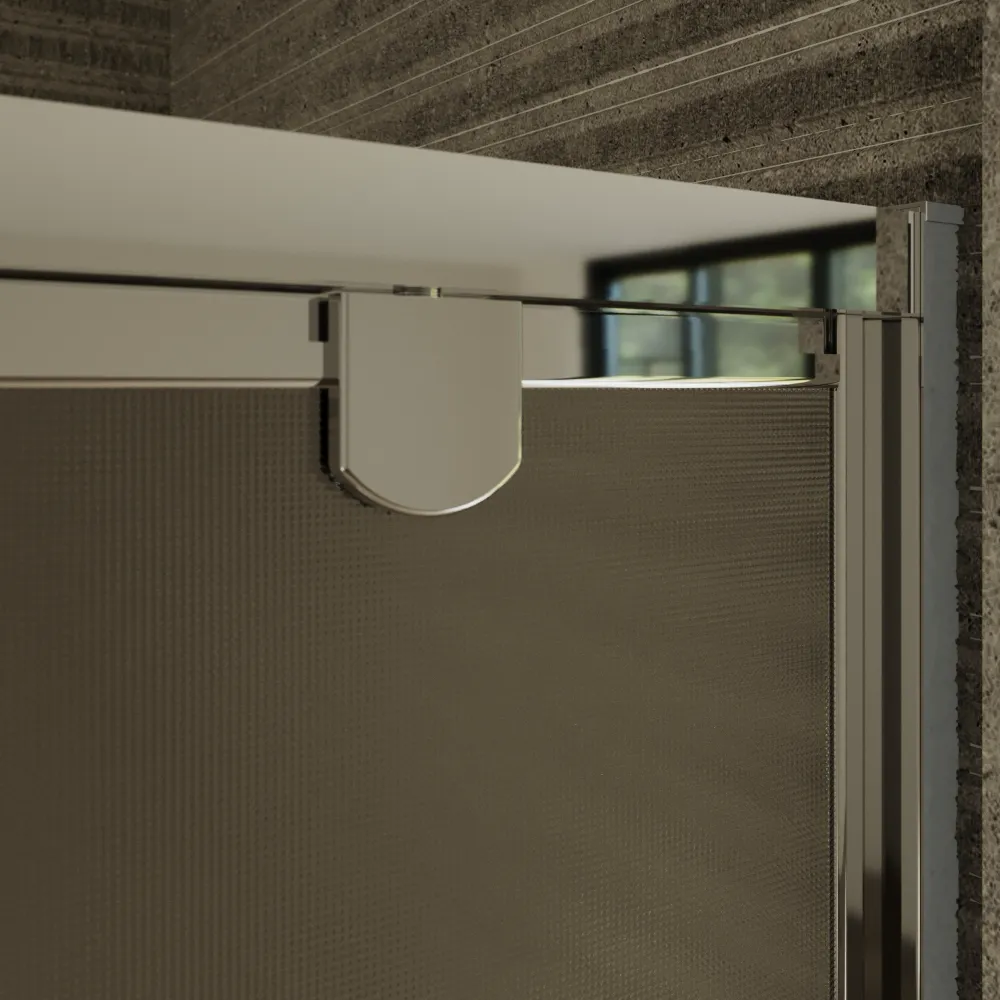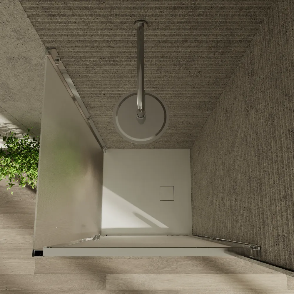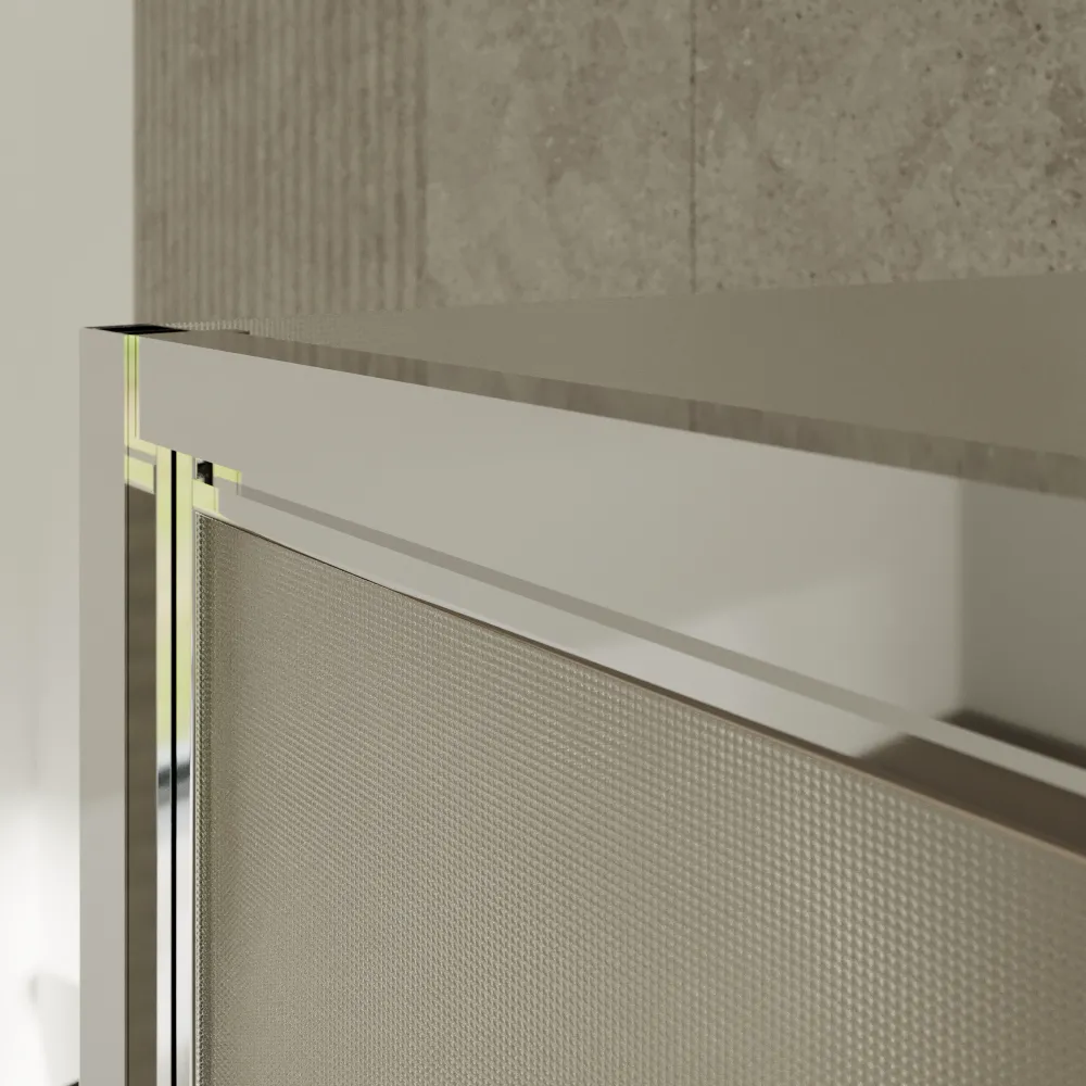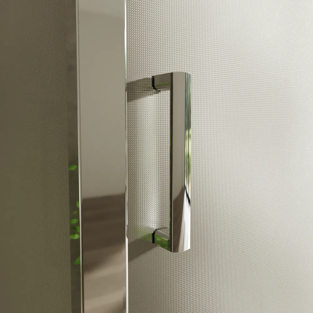 Realizzato con vetro temperato stampato da 6 mm, conforme alla norma EN12150-1, garantisce sicurezza e resistenza. I profili in alluminio cromato sono duraturi, facili da pulire e resistenti a calcare e macchie.