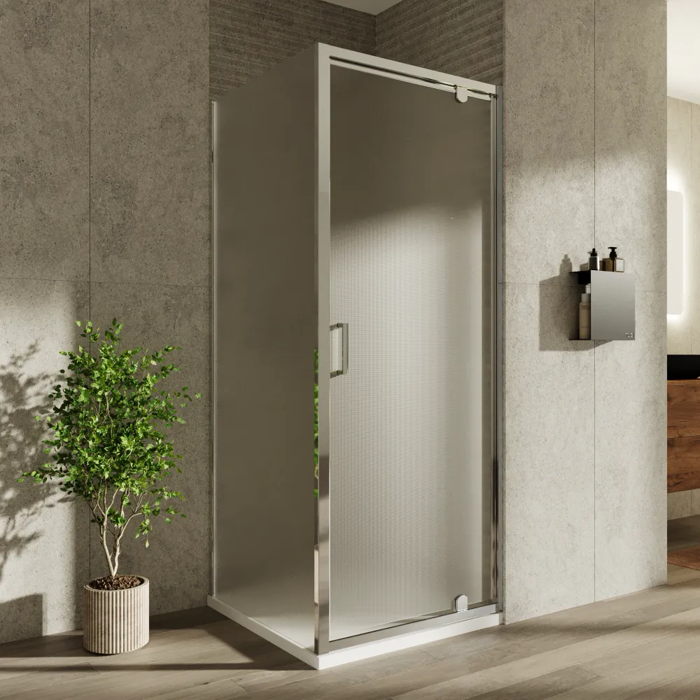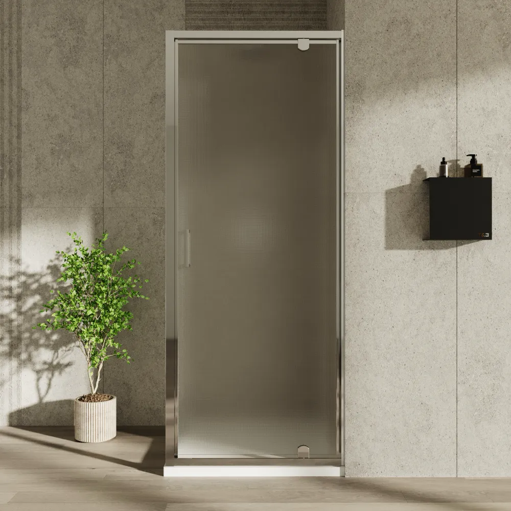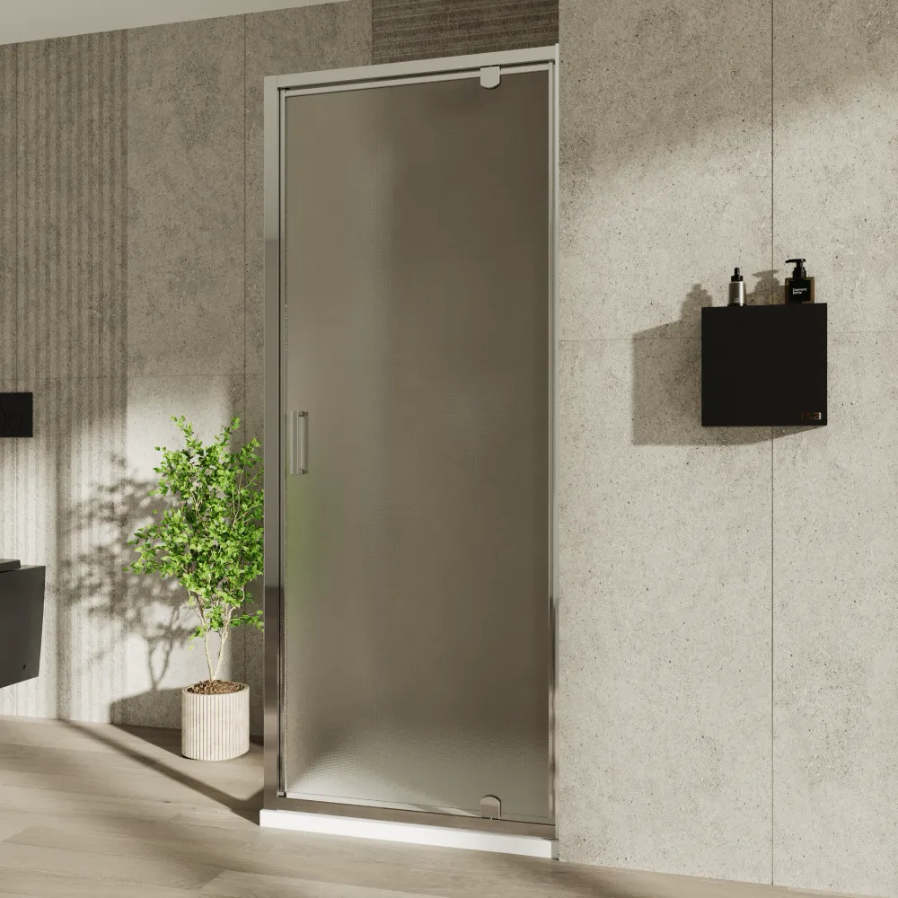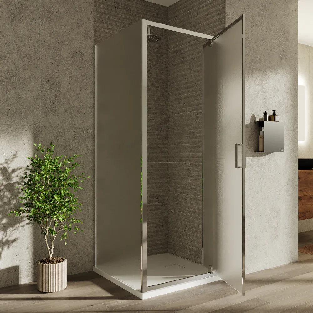 Realizzato con vetro temperato stampato da 6 mm, conforme alla norma EN12150-1, garantisce sicurezza e resistenza. I profili in alluminio cromato sono duraturi, facili da pulire e resistenti a calcare e macchie.