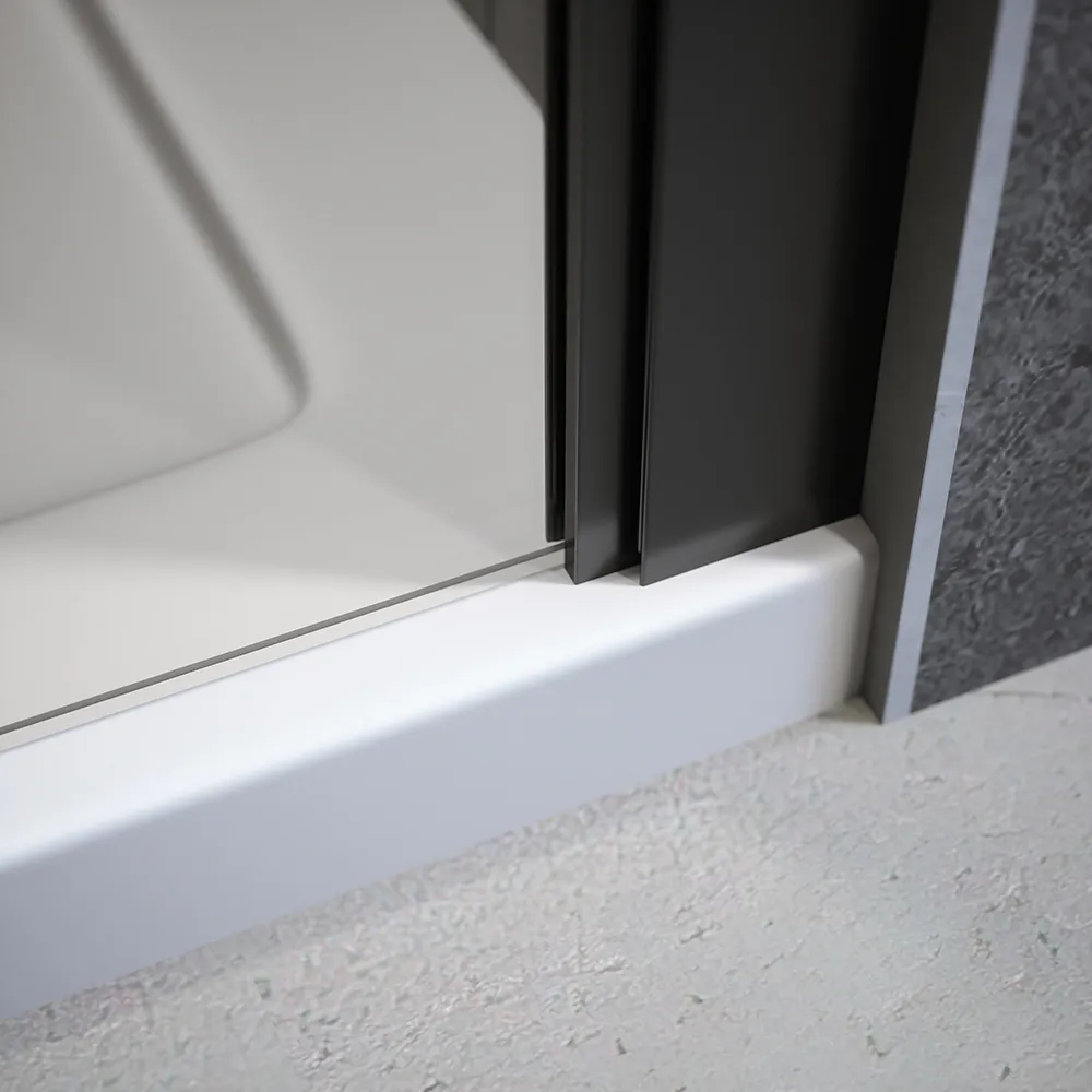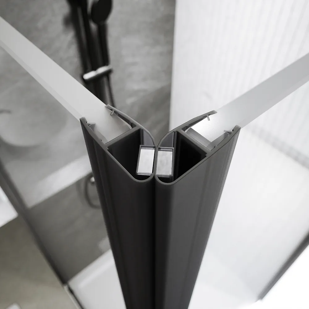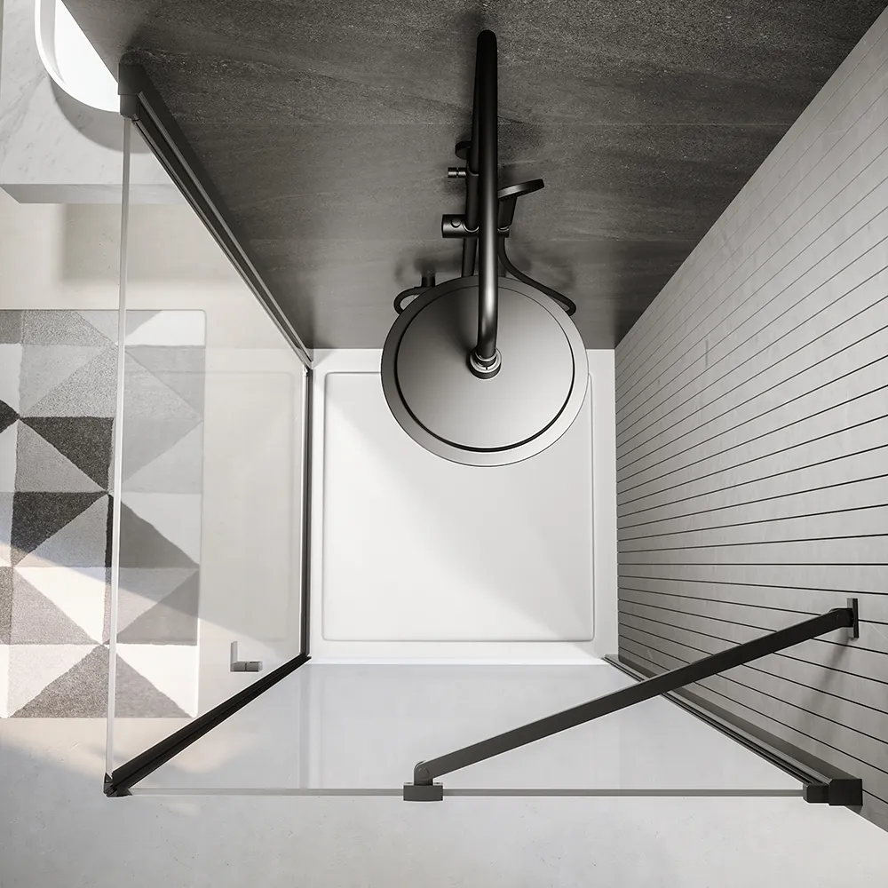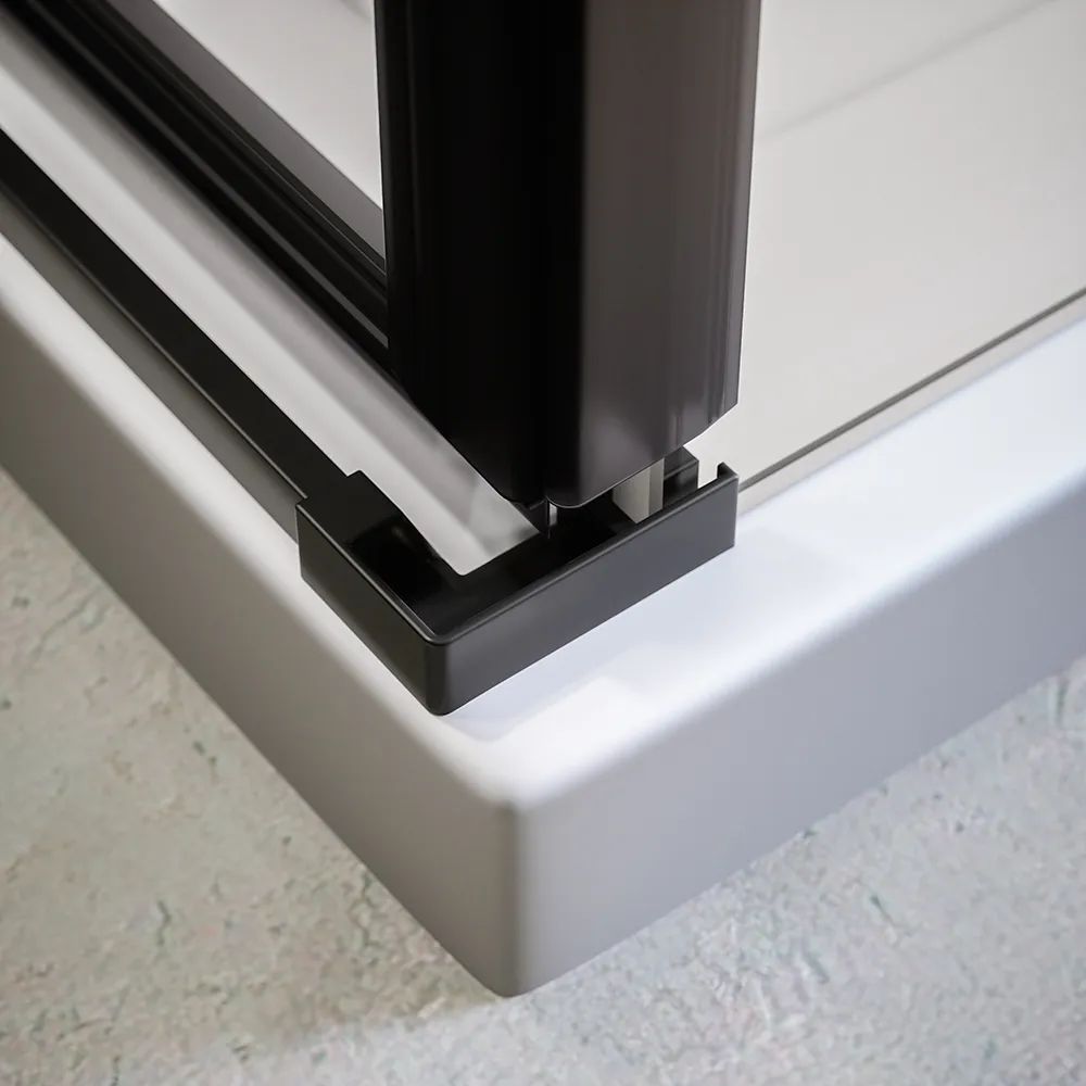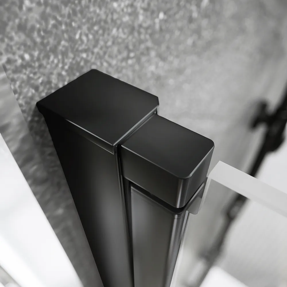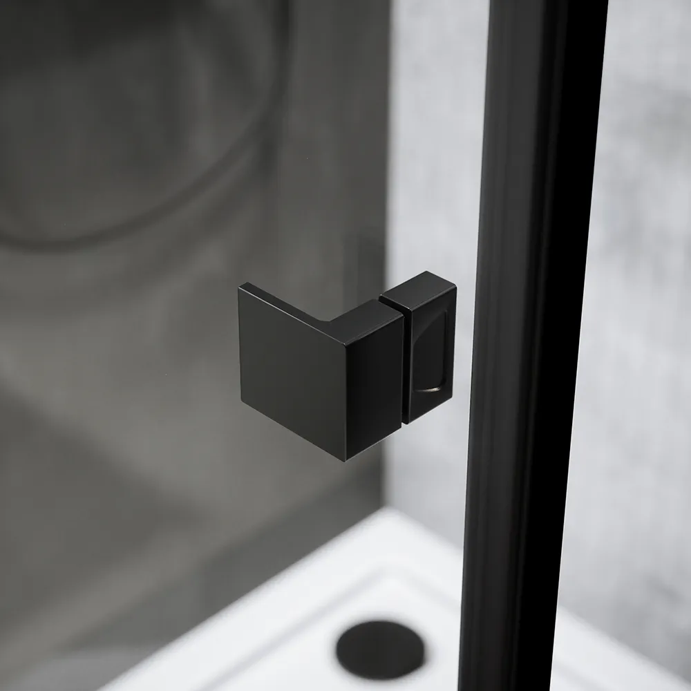 I profili in alluminio nero opaco aggiungono un tocco di raffinatezza e modernità al box doccia, contrastando elegantemente con il vetro trasparente.