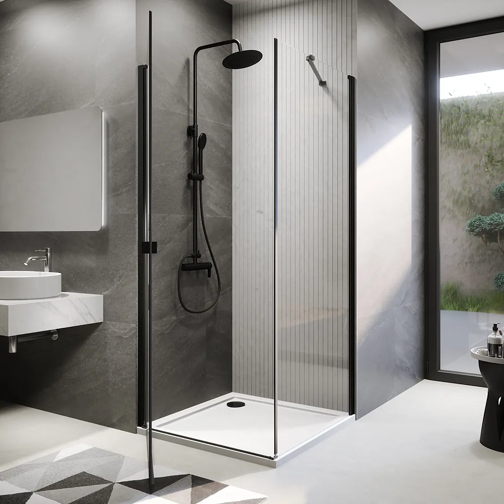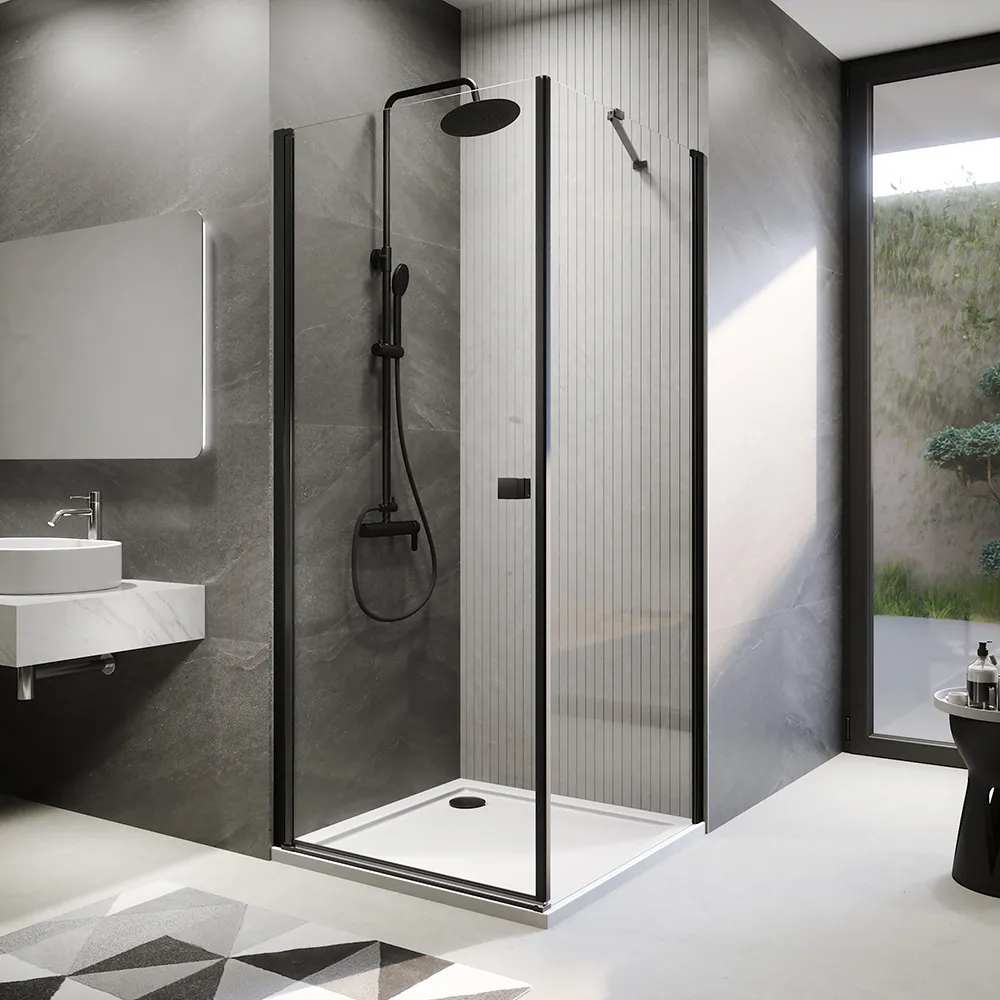 Box doccia 80x80 cm con apertura a battente e parete fissa, profili nero opaco e vetro da 8mm trasparente h195 | Fiji