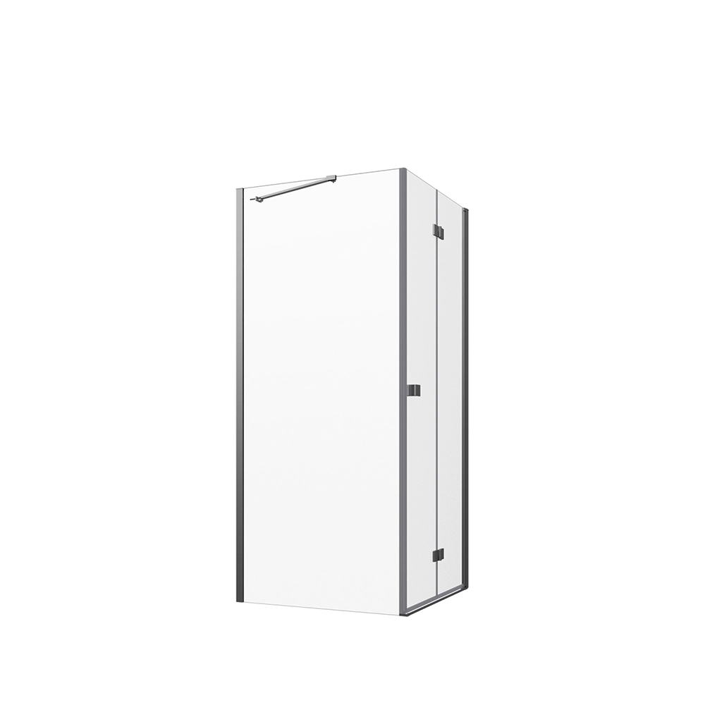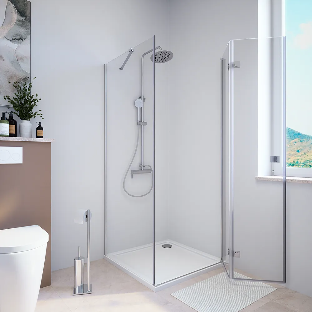 Box doccia 80x80 cm con apertura a libro lato destro e parete fissa, profili cromati e vetro 8mm trasparente h195 | Fiji