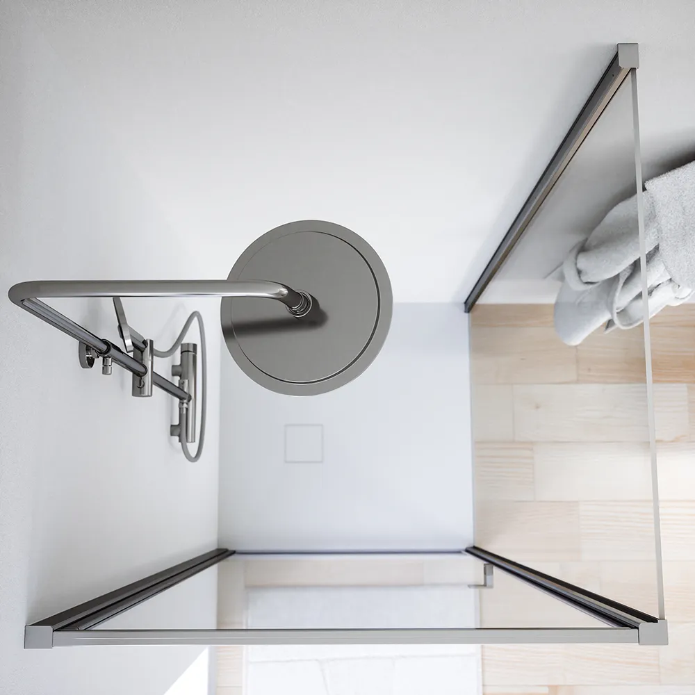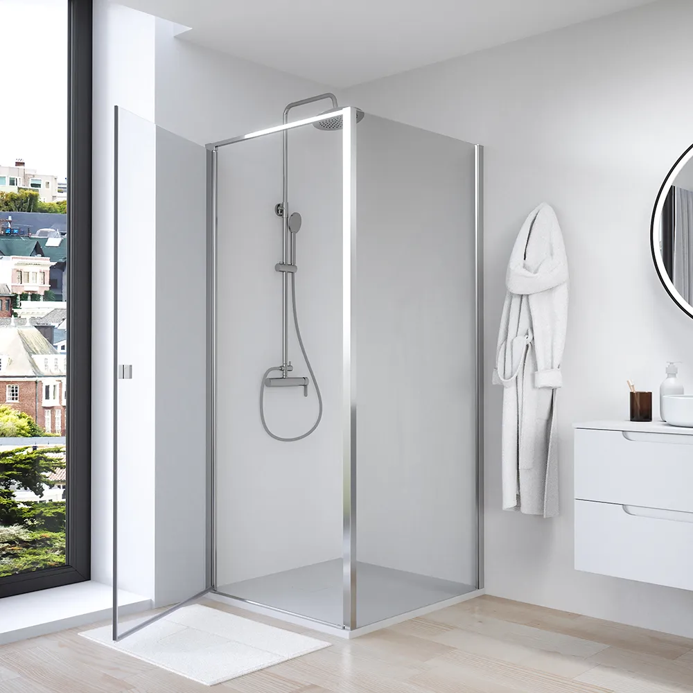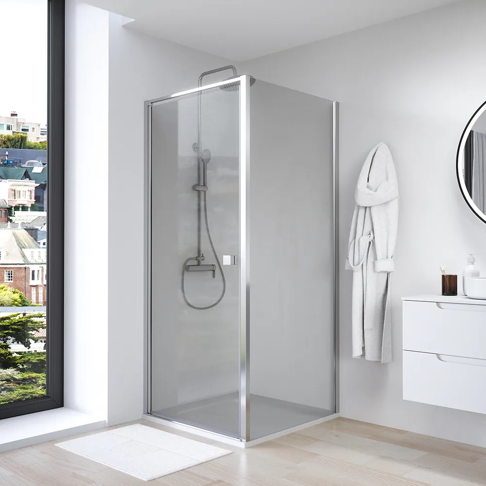 Questo modello è dotato di una porta con apertura a battente da 90cm, studiata per offrire un accesso facile e senza ostacoli. La parete fissa da 90cm, oltre a delimitare lo spazio, fornisce una protezione efficace contro gli schizzi, mantenendo il tuo bagno sempre pulito e asciutto.