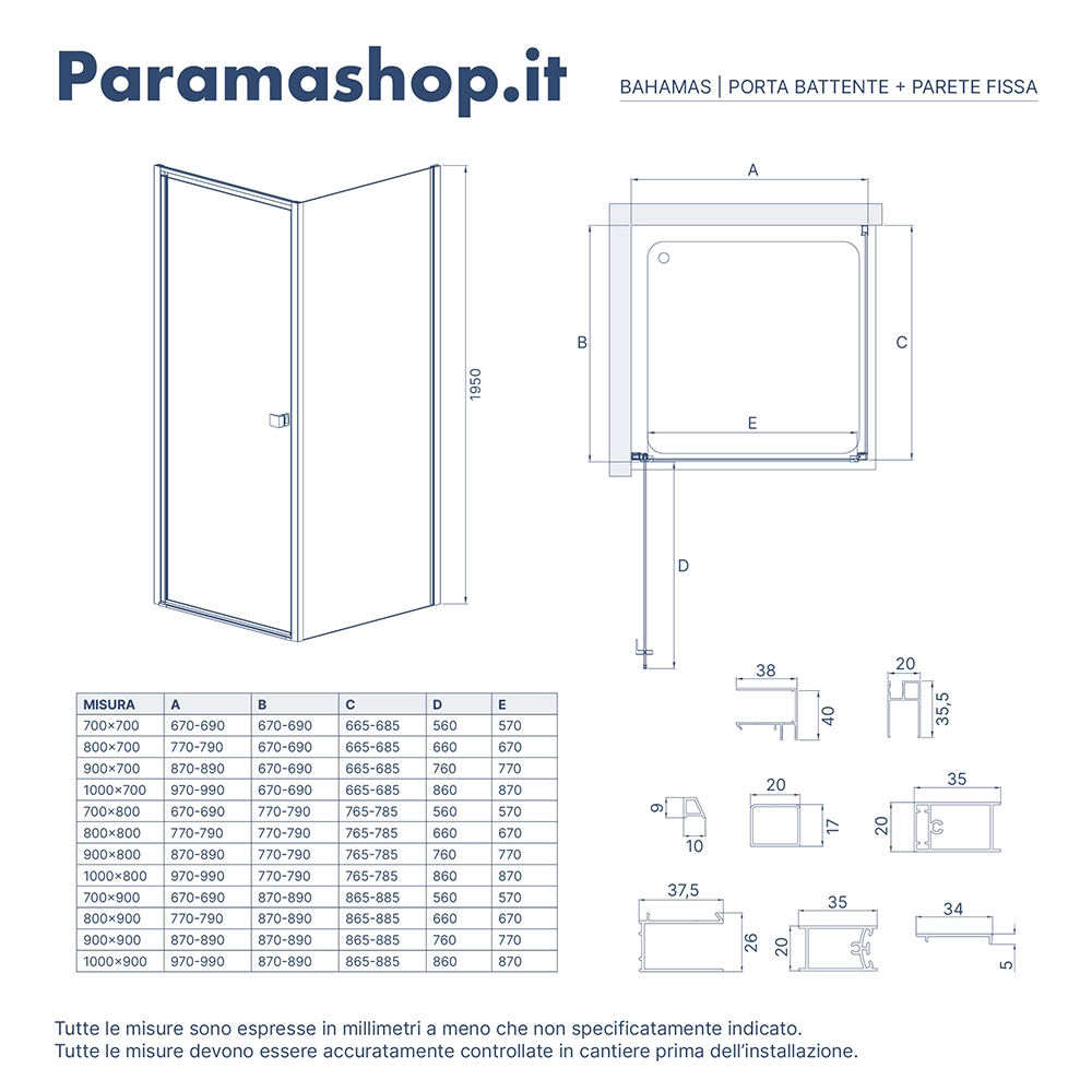 - Apertura a battente da 90 cm, parete fissa da 90 cm