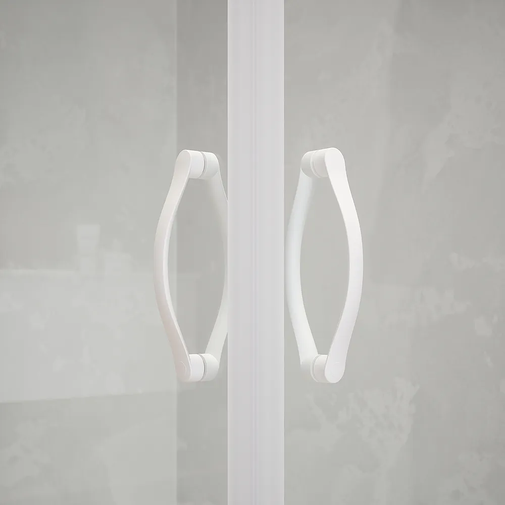Anche la maniglia bianca riprende questo stile, con la sua forma squadrata e il colore neutro che si sposano perfettamente con le linee del box. Completa il quadro l'angolo in plastica bianca, che rifinisce con cura l'ambiente doccia. Il colore bianco, infatti, si integra perfettamente con il design del box, creando un'armonia visiva che non lascia spazio a imperfezioni.