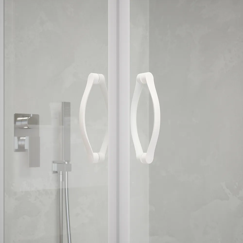 Anche la maniglia bianca riprende questo stile, con la sua forma squadrata e il colore neutro che si sposano perfettamente con le linee del box. Completa il quadro l'angolo in plastica bianca, che rifinisce con cura l'ambiente doccia. Il colore bianco, infatti, si integra perfettamente con il design del box, creando un'armonia visiva che non lascia spazio a imperfezioni.