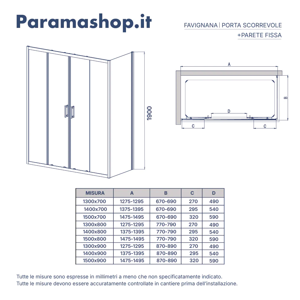 Favignana è installabile reversbilmente con orientamento sia verso destra che verso sinistra. Sarete voi insieme al vostro installatore di fiducia, valutando le caratteristiche del vostro bagno, a deciderne la migliore collocazione. Il montaggio è semplificato da un dettagliato manuale d'uso e dai profili in alluminio regolabili che permetteranno di concludere con successo l'installazione anche nel caso di un piccolo fuorisquadro. La parete fissa del box doccia può essere regolata da 77-79cm, mentre la porta scorrevole può variare da 137,5-139,5cm.