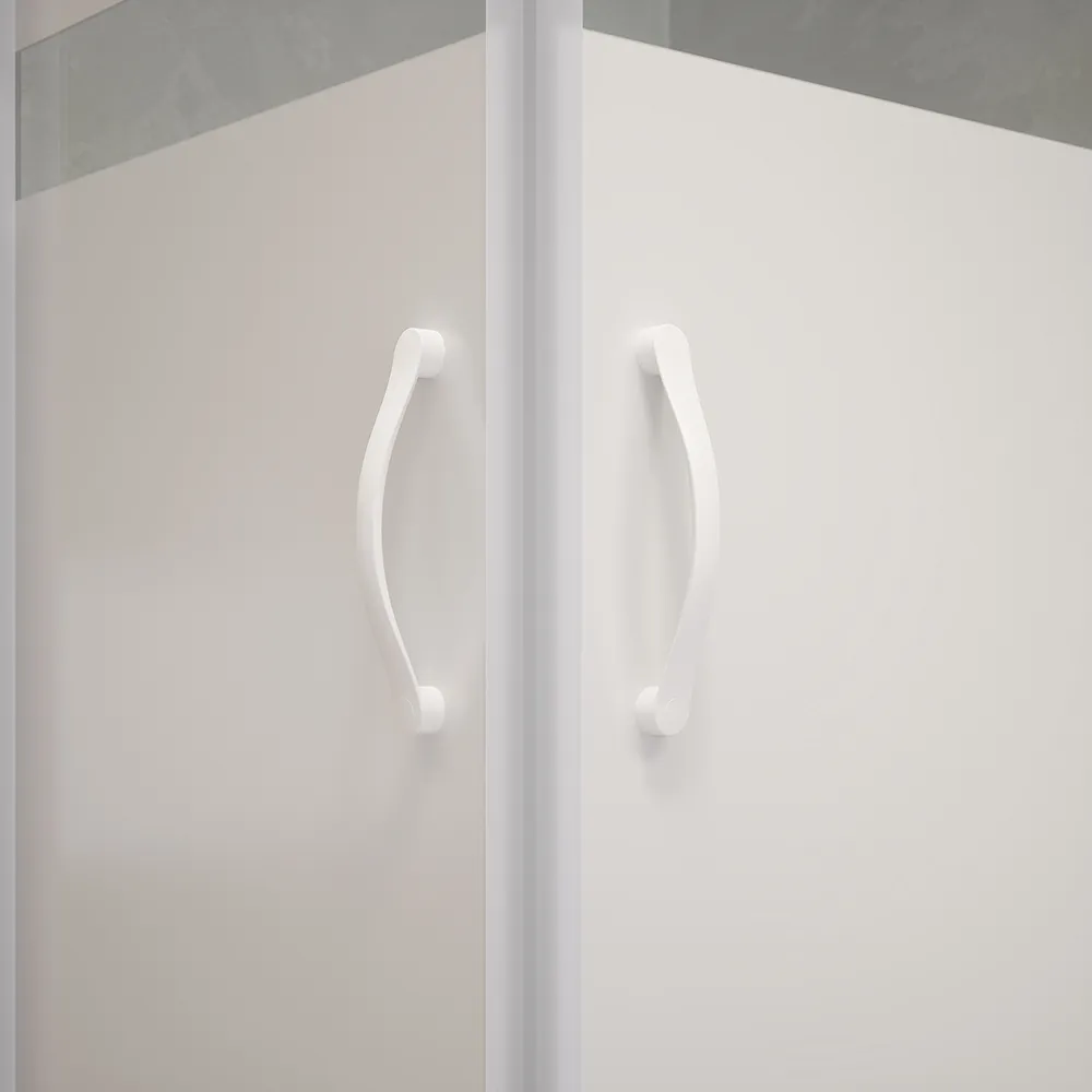 Anche la maniglia bianca riprende questo stile, con la sua forma squadrata e il colore neutro che si sposano perfettamente con le linee del box. Il colore bianco, infatti, si integra perfettamente con il design del box, creando un'armonia visiva che non lascia spazio a imperfezioni.