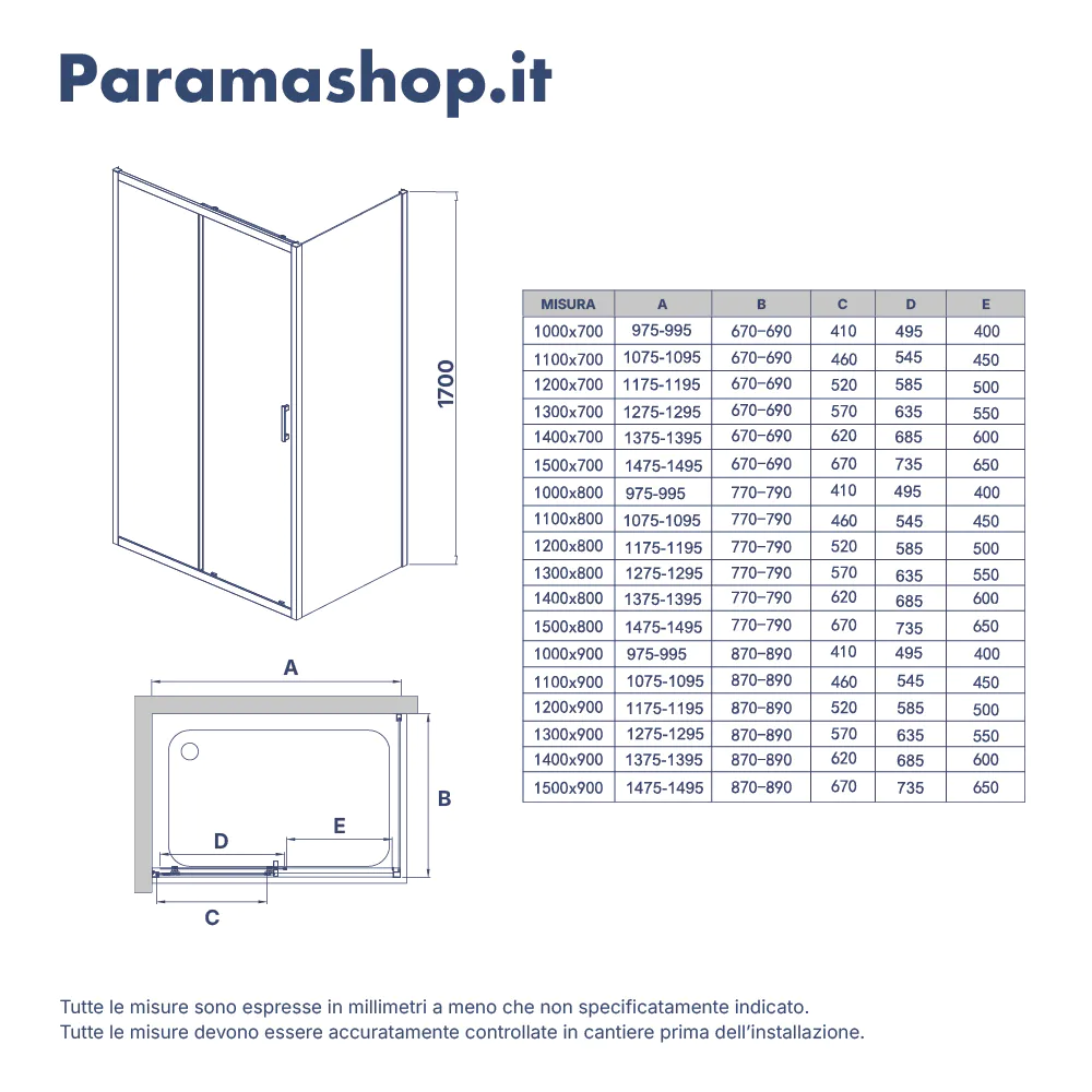 Questo modello è composto da una porta scorrevole da 140 cm e una parete fissa da 80 cm, con altezza di 170 cm: più contenuta rispetto agli standard, permette di installarlo anche in bagni con soffitti bassi senza sacrificare lo spazio interno e la comodità durante la doccia. L’installazione reversibile lo rende estremamente versatile, adattandosi facilmente a differenti configurazioni del tuo bagno.