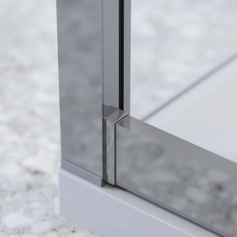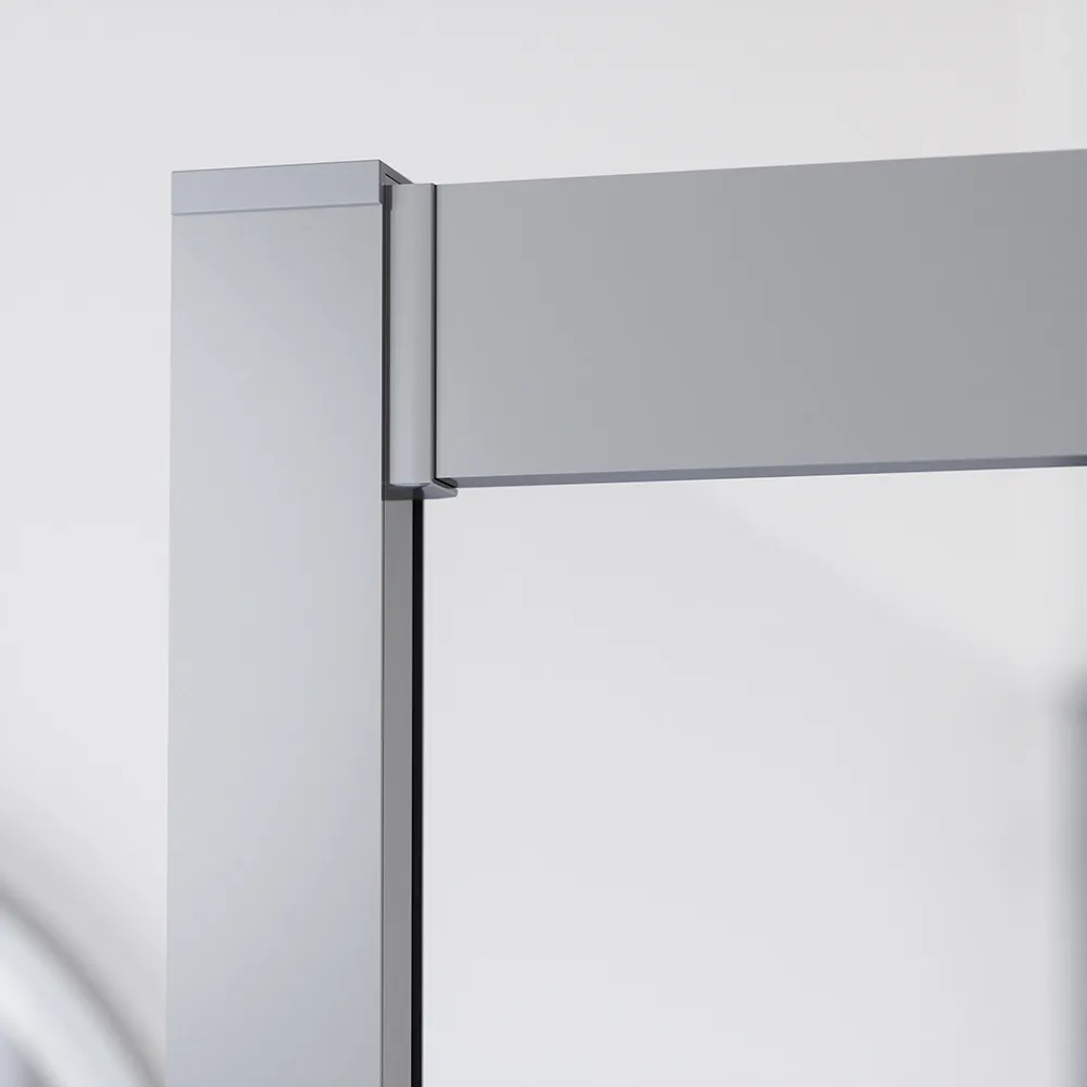 Questo modello è realizzato in vetro temperato trasparente di 6 mm, certificato EN12150-1, e arricchito da profili squadrati in alluminio cromato, che garantiscono sicurezza, resistenza e una facile manutenzione.