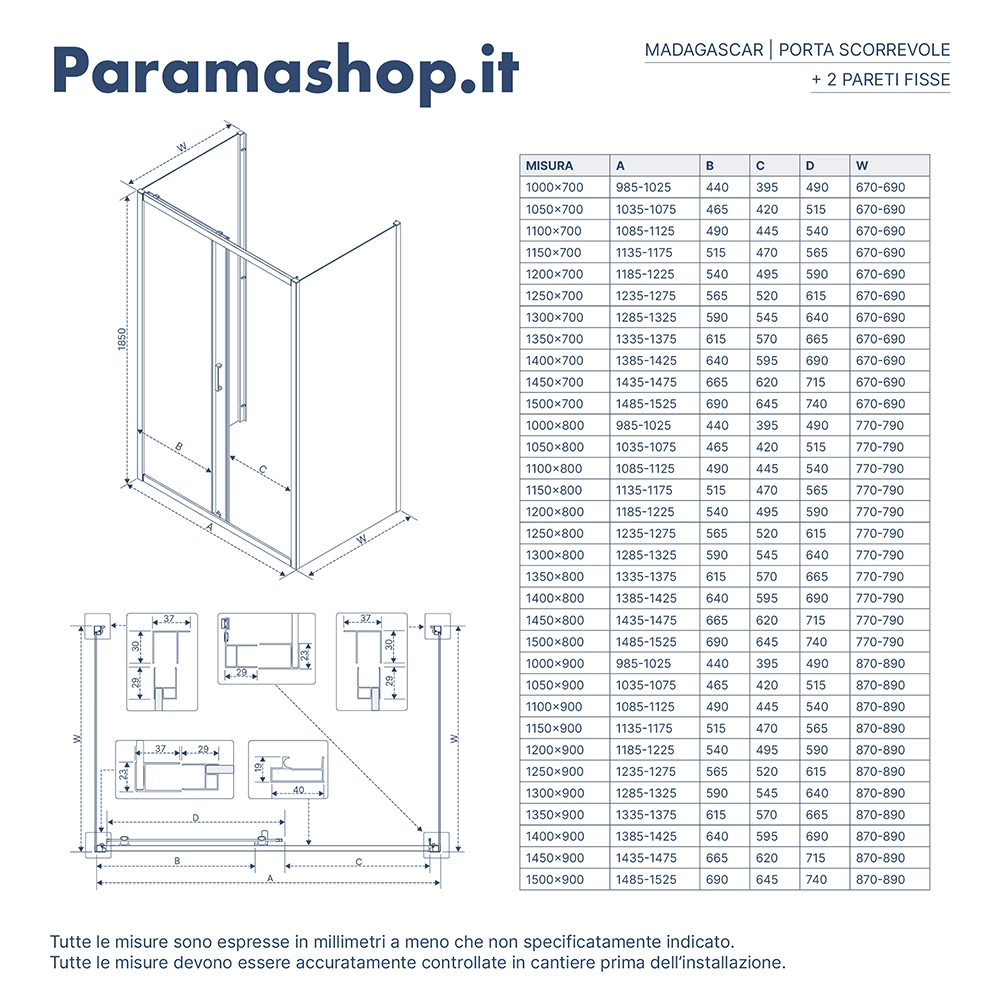 - Porta scorrevole da 125cm, due pareti fisse da 70cm