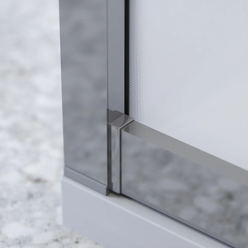 Questo modello è realizzato in vetro temperato stampato di 6 mm, certificato EN12150-1, e arricchito da profili squadrati in alluminio cromato, che garantiscono sicurezza, resistenza e una facile manutenzione.