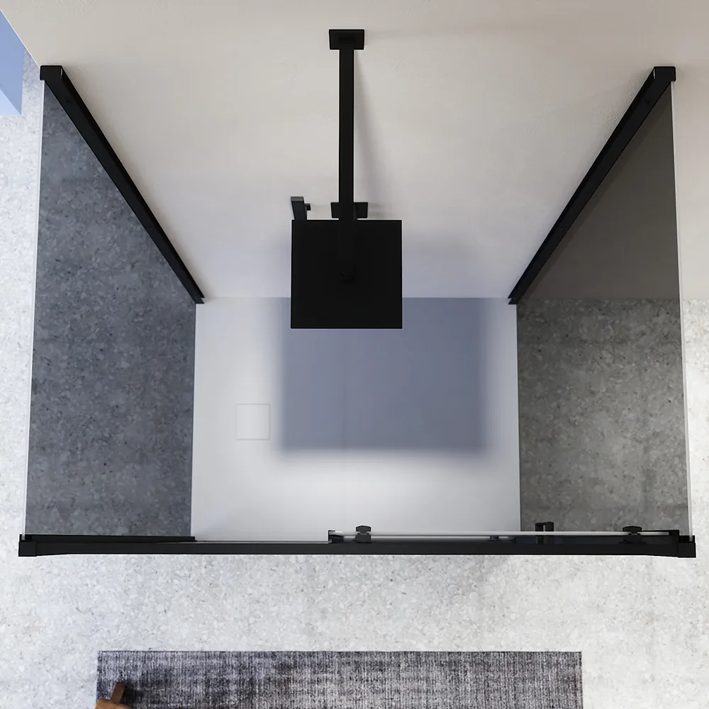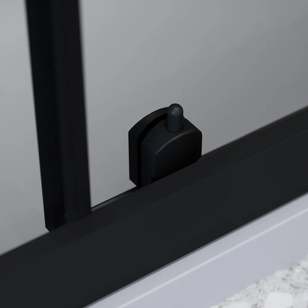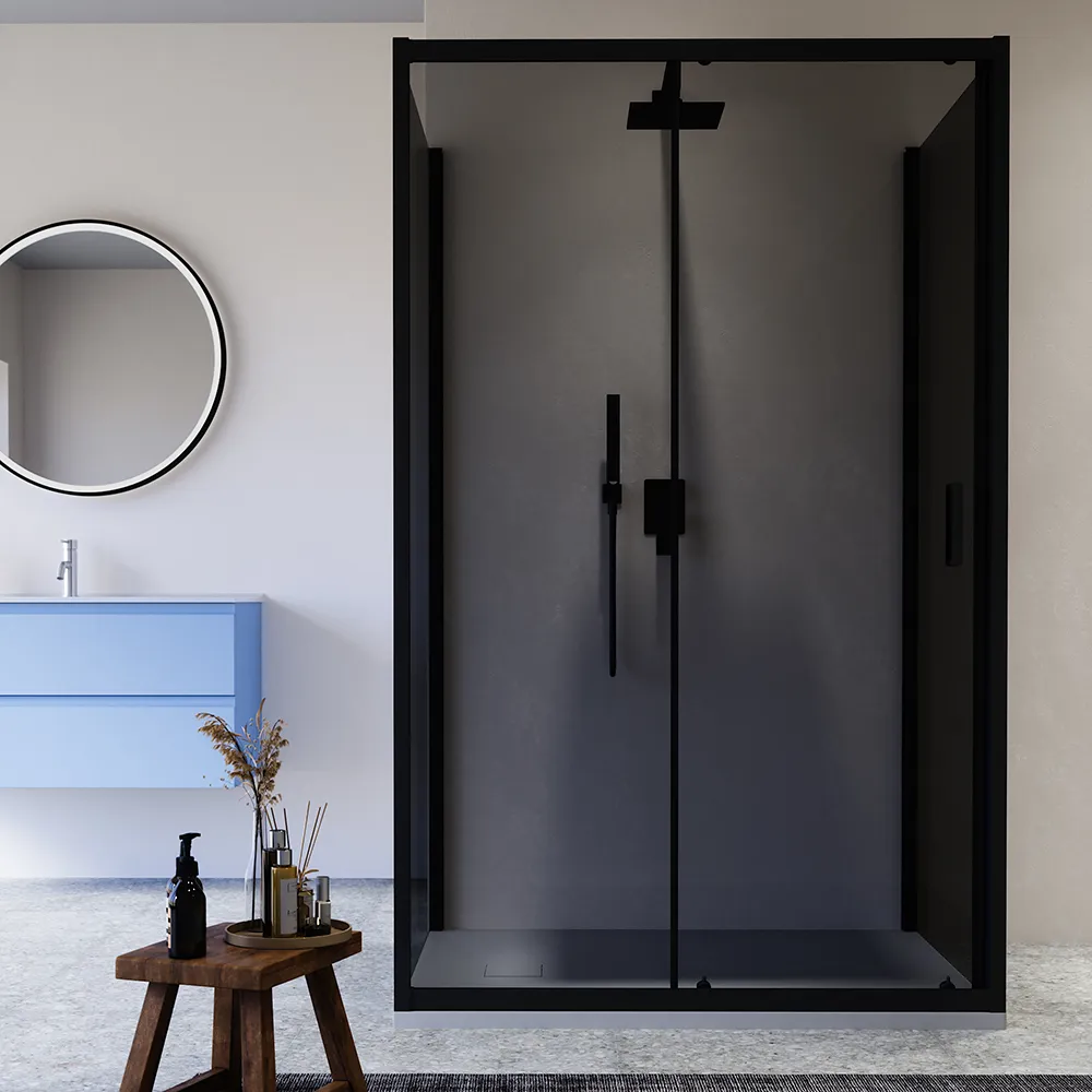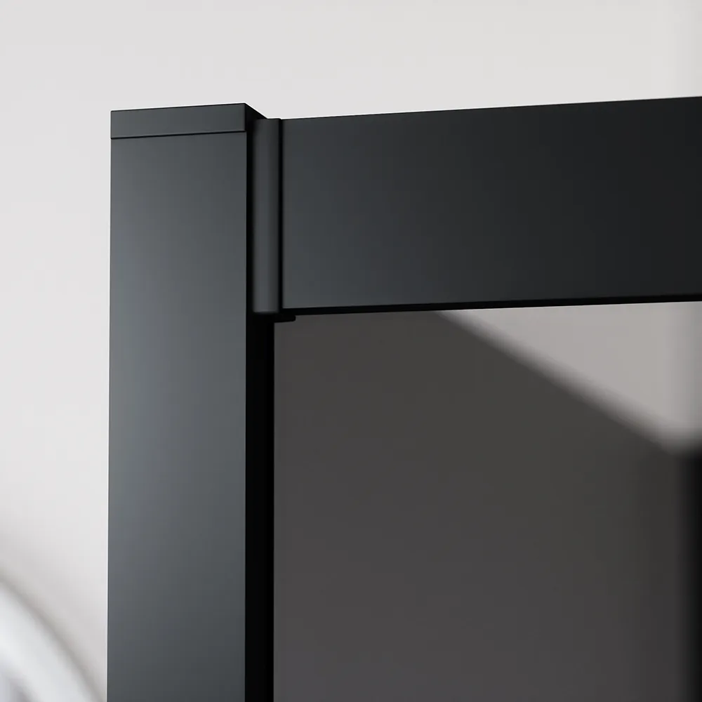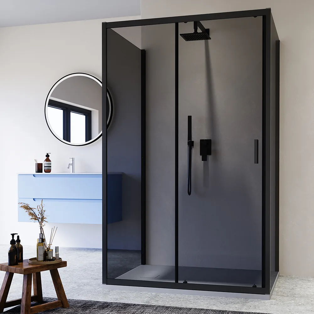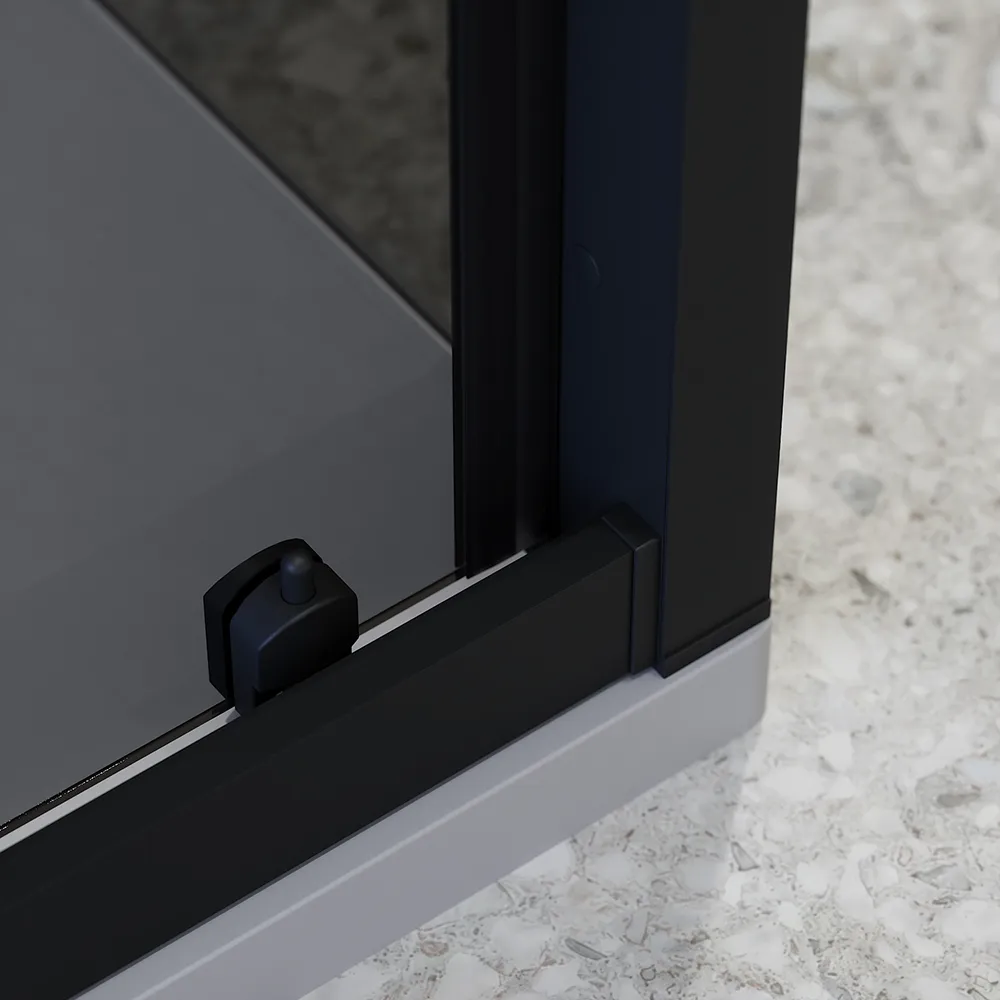 Questo modello è realizzato in vetro temperato fumè di 6 mm, certificato EN12150-1, e arricchito da profili squadrati in alluminio nero opaco, che garantiscono sicurezza, resistenza e una facile manutenzione.