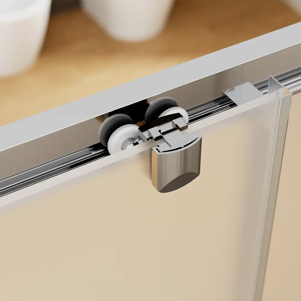 Il prodotto in oggetto è fornito con maniglia in ABS cromato dalla forma squadrata, presente sia internamente che esternamente, e di un sistema di apertura basato su 8 carrelli scorrevoli con cuscinetti in metallo e cover in ABS cromato. I carrelli inferiori, al fine di facilitare la pulizia quotidiana, sono dotato di sgancio-rapido mentre la chiusura del box è semplificata da un kit di guarnizioni magnetiche verticali utile anche ad impermeabilizzare lo spazio doccia.