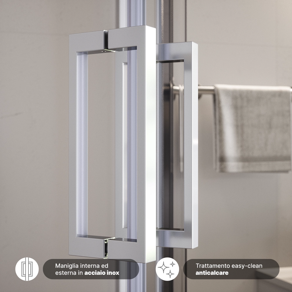Il vetro temperato da 6mm, certificato secondo gli standard EN12150-1, è disponibile in versione trasparente o opaca, offrendo una scelta personalizzata in base alle tue preferenze estetiche e di privacy. Il trattamento easy-clean anticalcare applicato al vetro semplifica la pulizia quotidiana, assicurando una lucentezza costante nel tempo.